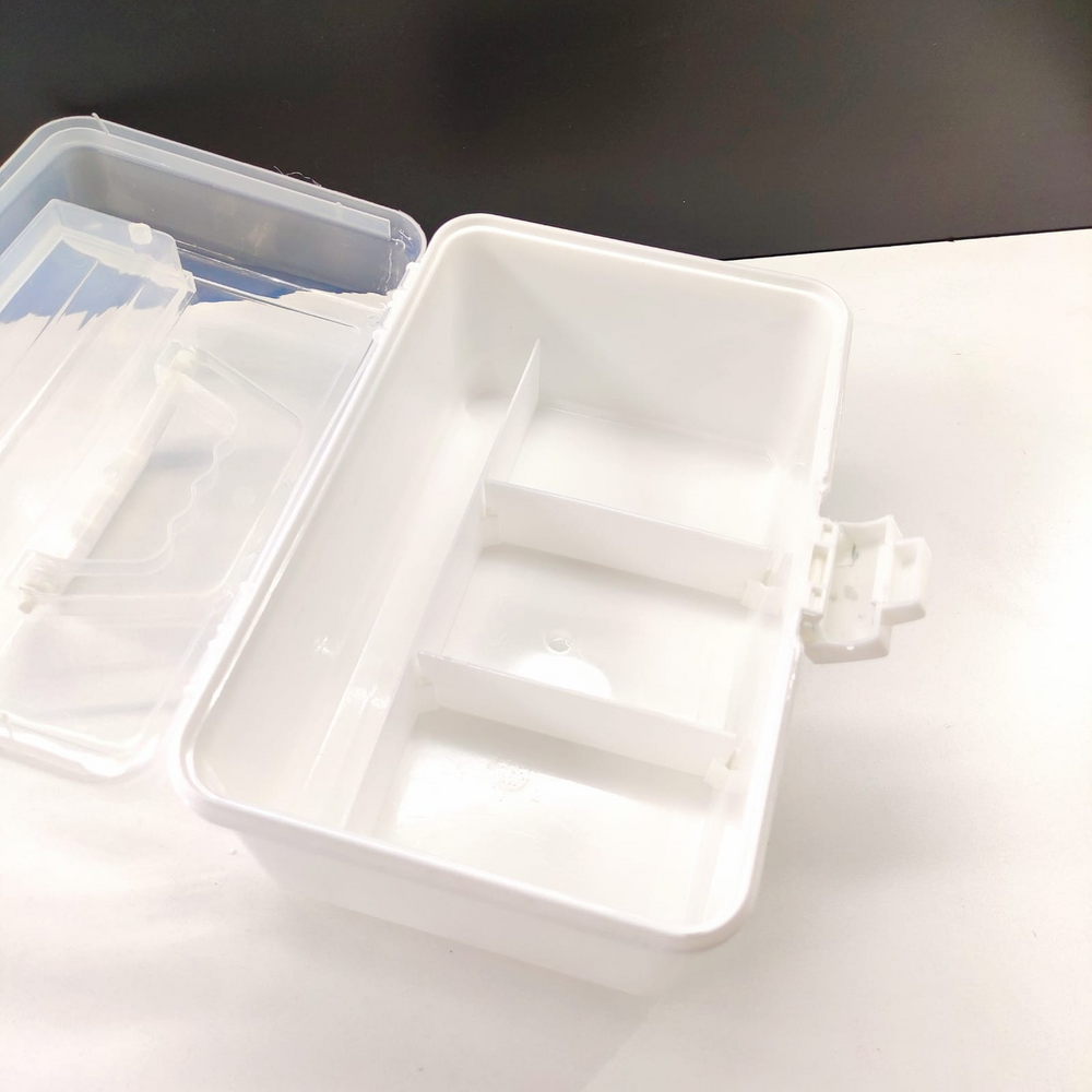 (Caja botiquín de plástico, diseño en un color con tapa transparente. En su interior tiene 3 divisiones de largo 11,5cm x ancho 8cm aprox y 1 con un largo de 25cm x ancho 3,5. en su tapa también trae un división de largo 5cm x ancho 20cm.)