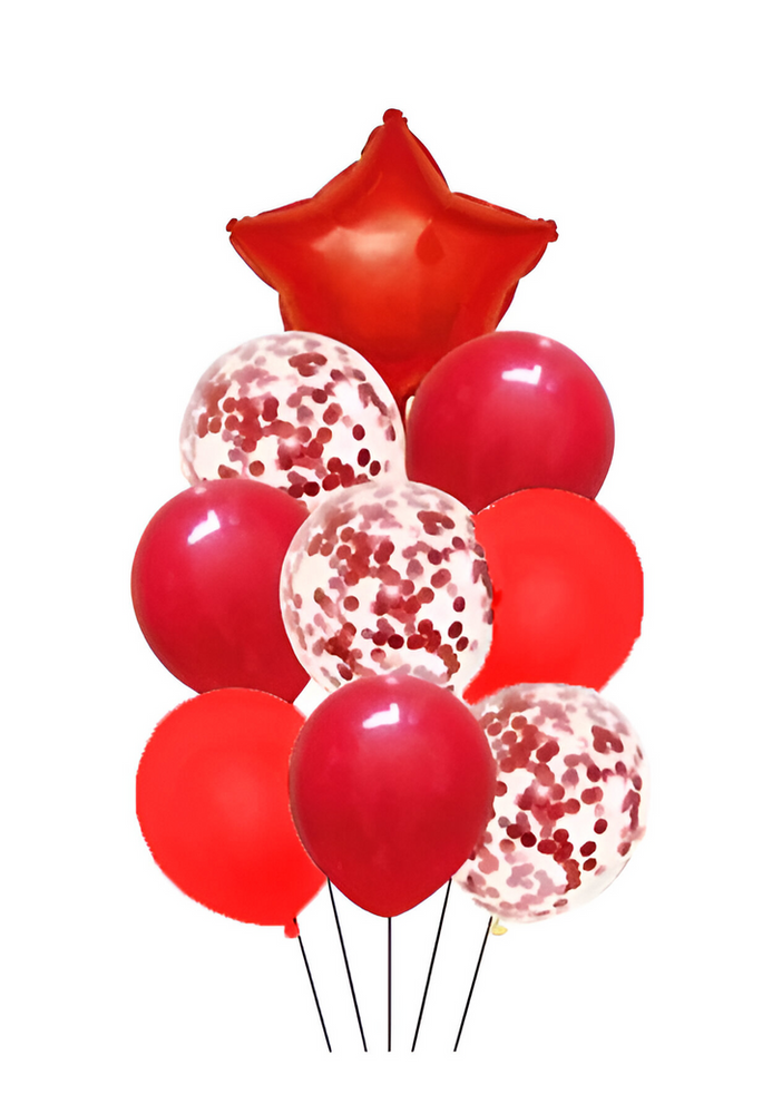 (Set x9 globos, este contiene: 5 globos rojo, 3 transparentes con confite y uno con forma de estrella de 40x45cm aprox. Incluye cinta para atar los globos y pajilla para inflarlos fácilmente).