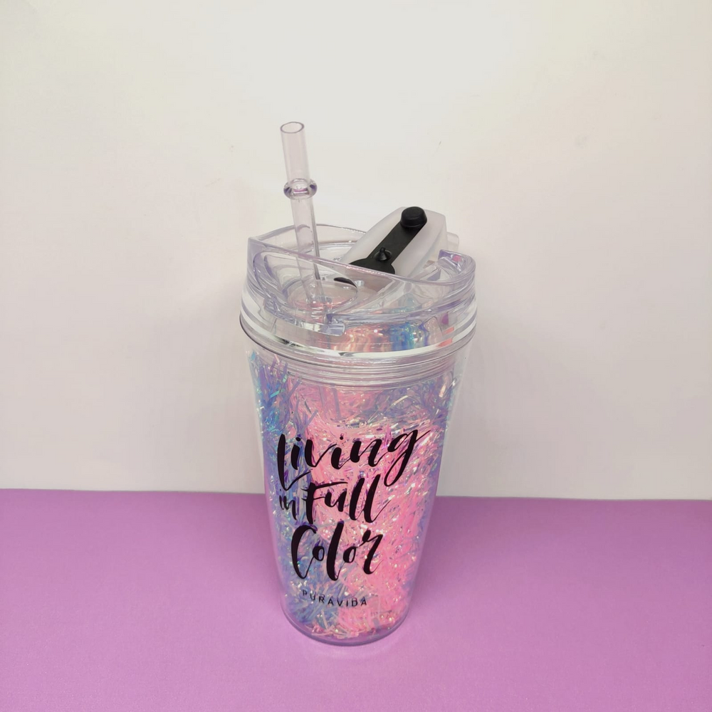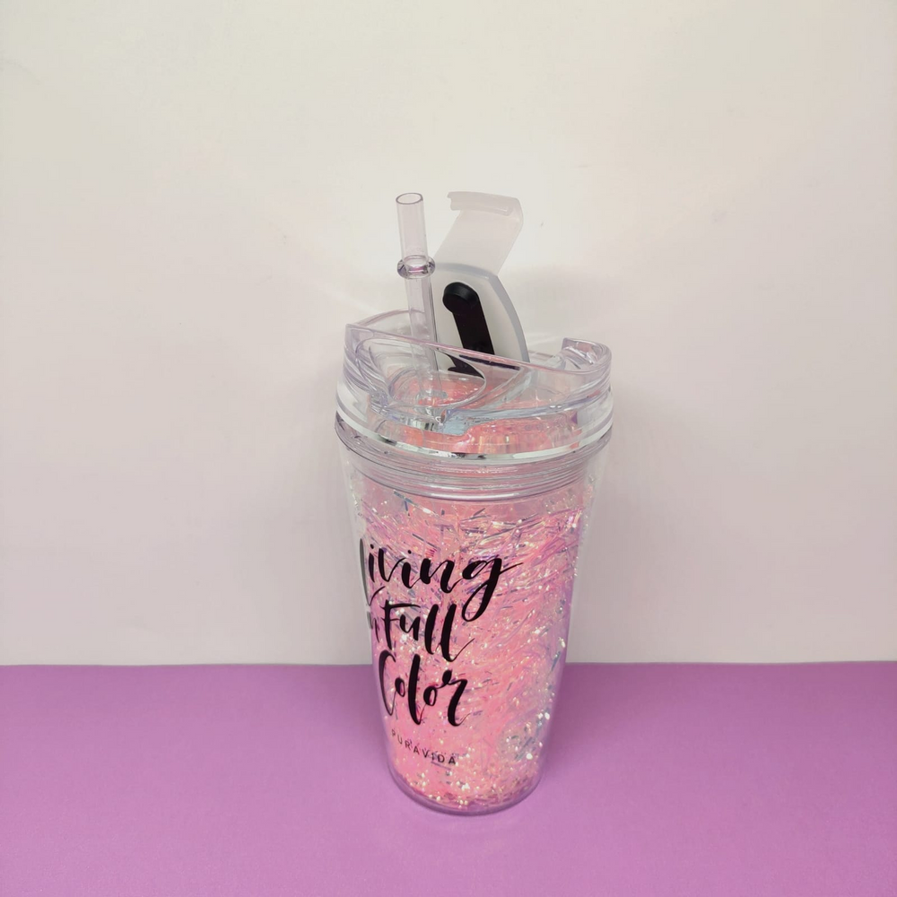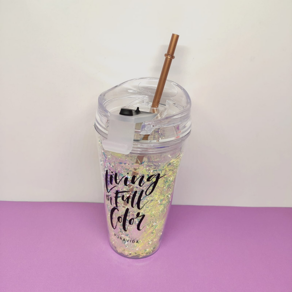 (Vaso de acrilico transparente, doble pared entre ellas tiritas brillosas. Su tapa es a rosca y tiene una gomita anti derrames. En ella una tapita para el pico a presión. Tambien Incluye sorbete con un largo de 23cm Aprox.)