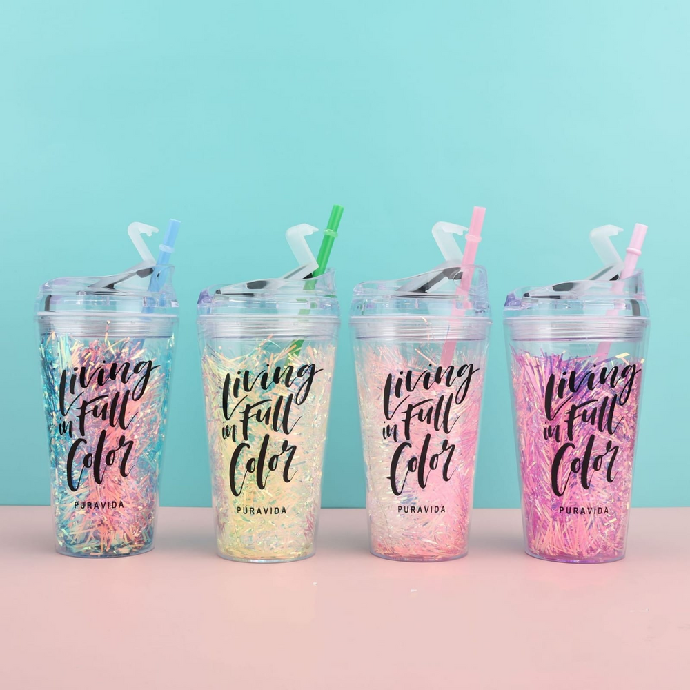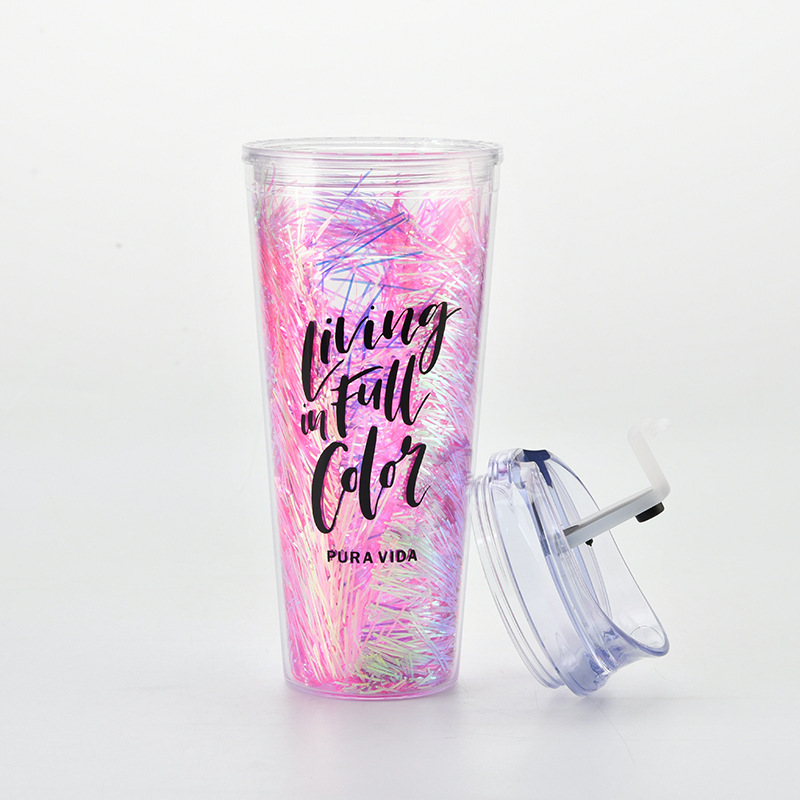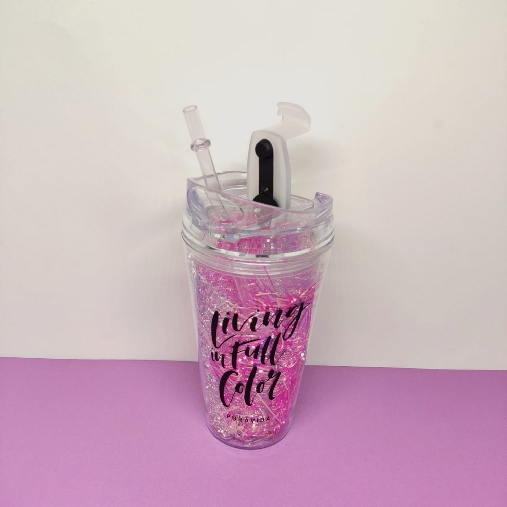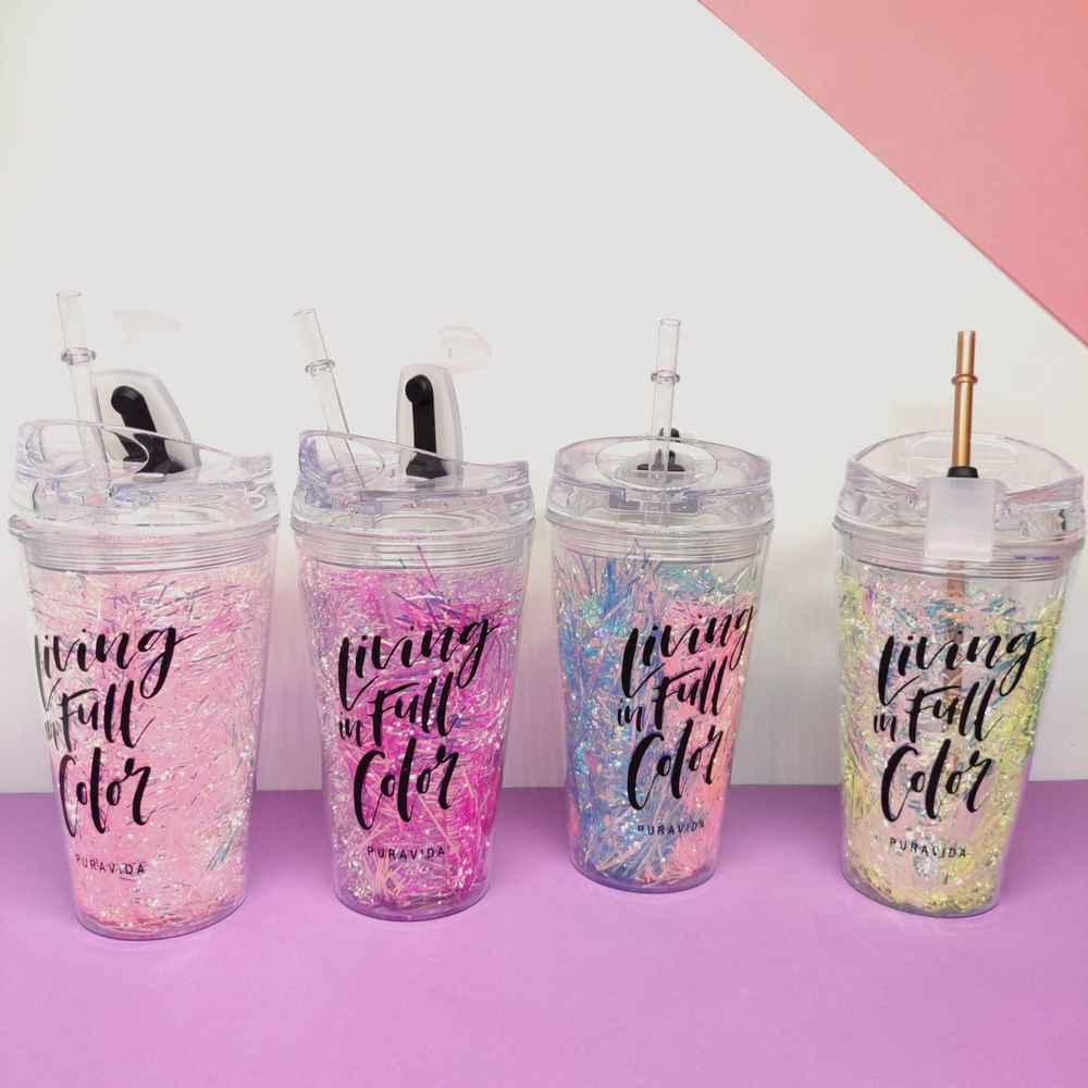(Vaso de acrilico transparente, doble pared entre ellas tiritas brillosas. Su tapa es a rosca y tiene una gomita anti derrames. En ella una tapita para el pico a presión. Tambien Incluye sorbete con un largo de 23cm Aprox.)