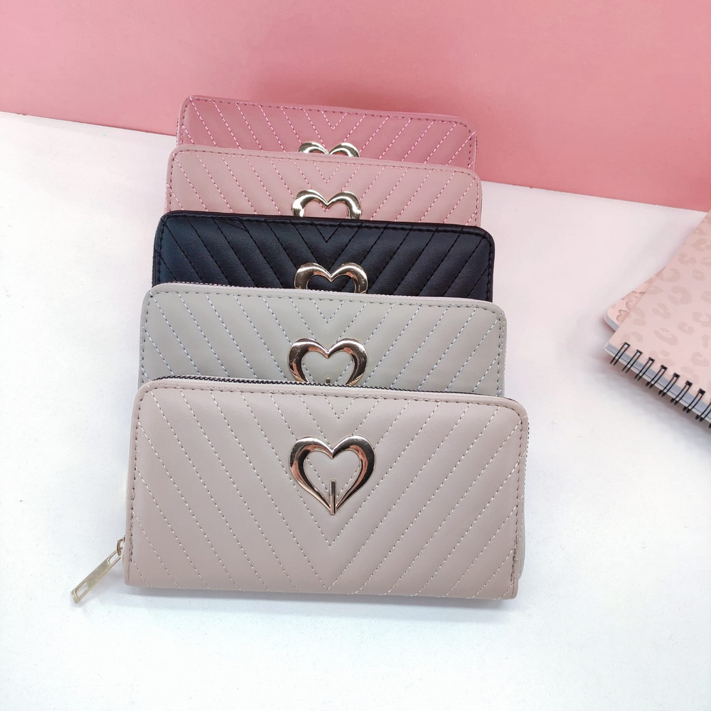 (Billetera grande diseño de costura, con un corazón dorado en su centro. Contiene triple compartimento, en el centro uno para monedas con cierre y 12 divisiones para tarjetas. )