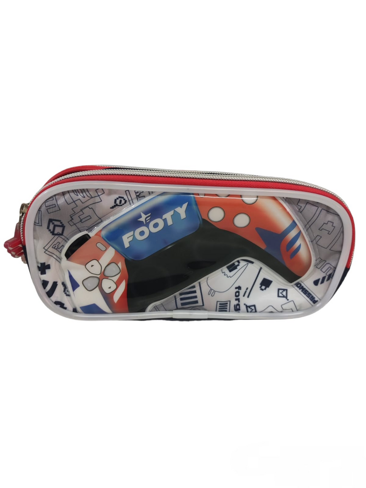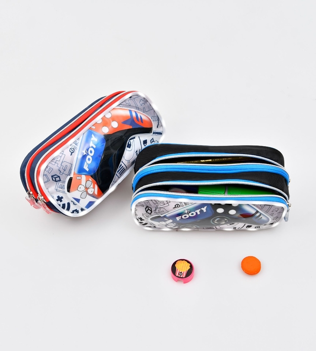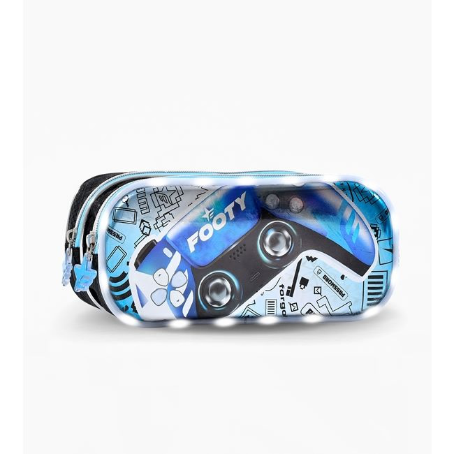 (Cartuchera Joystick Termoformado de la marca "Footy", con 2 cierres estampa sublimada y luz led a pilas, frente holográfico metalizado.)