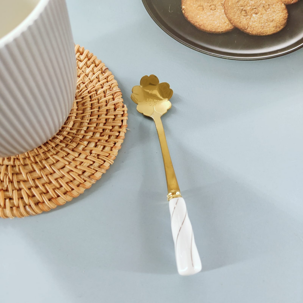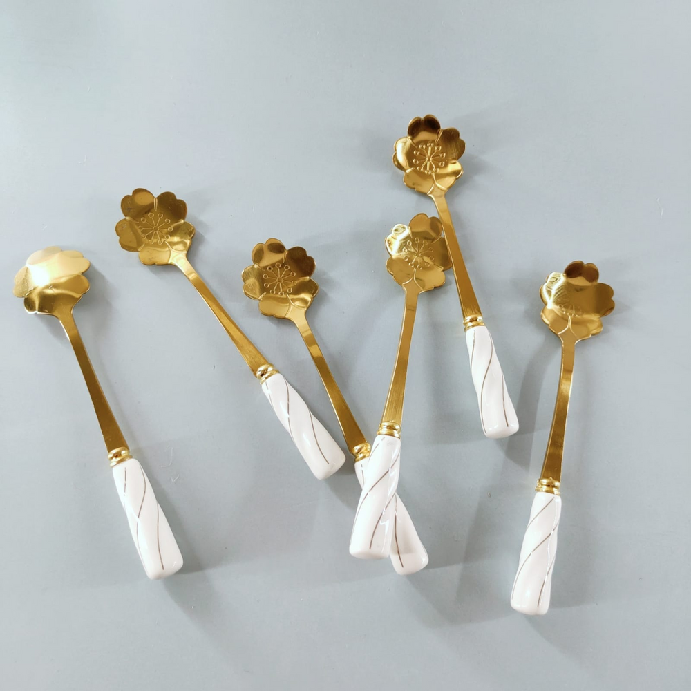 (Cucharita de bronce con forma de flor cerezo. Mango de cerámica con detalles de líneas doradas. Disponible en blister de 6 unidades. Idea para té o café. Su mango tiene forma de hojas. )