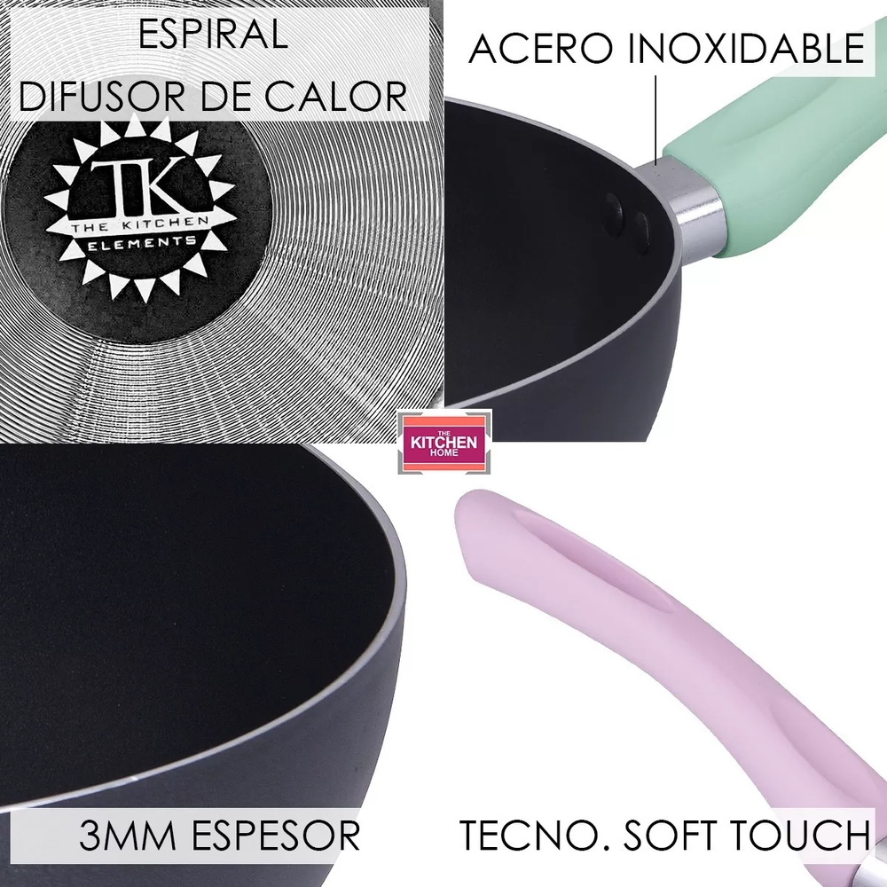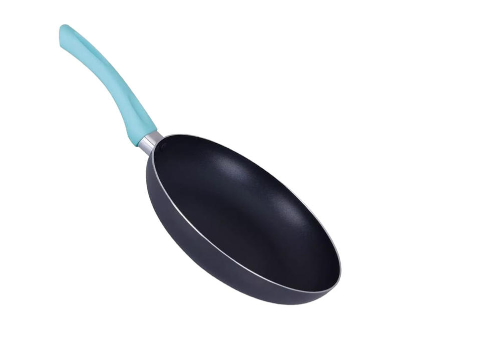 (Sarten de aluminio con revestimiento antiadherente y mango de plástico antideslizante en color celeste, la base de la misma cuenta con un sistema de espiral para una distribución rápida y uniforme del calor.)