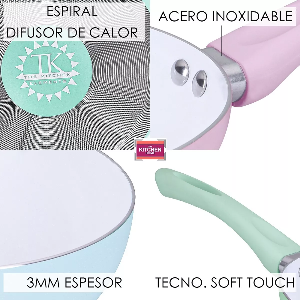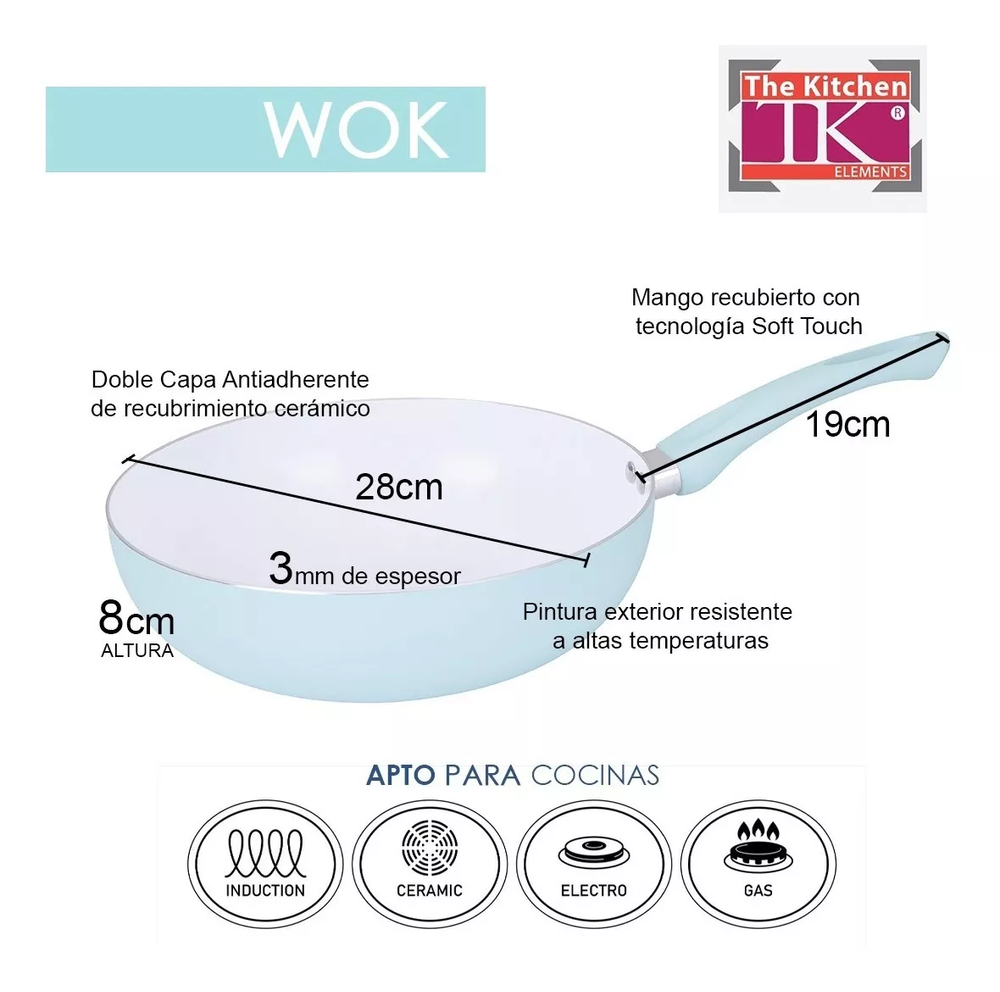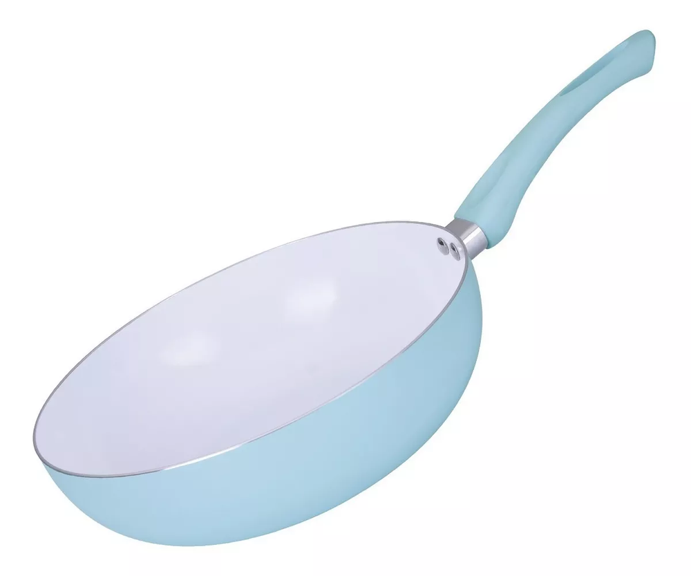 (Wok con revestimiento de cerámico antiadherente, pintado de color celeste pastel, con mango plástico antideslizante del mismo color. Su base cuenta con un sistema de espiral para una distribución rápida y uniforme del calor. Linea Sense de la marca "The Kitchen".)