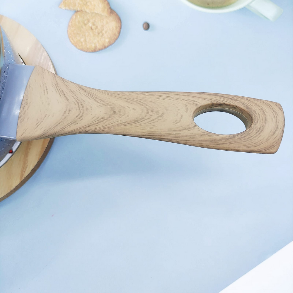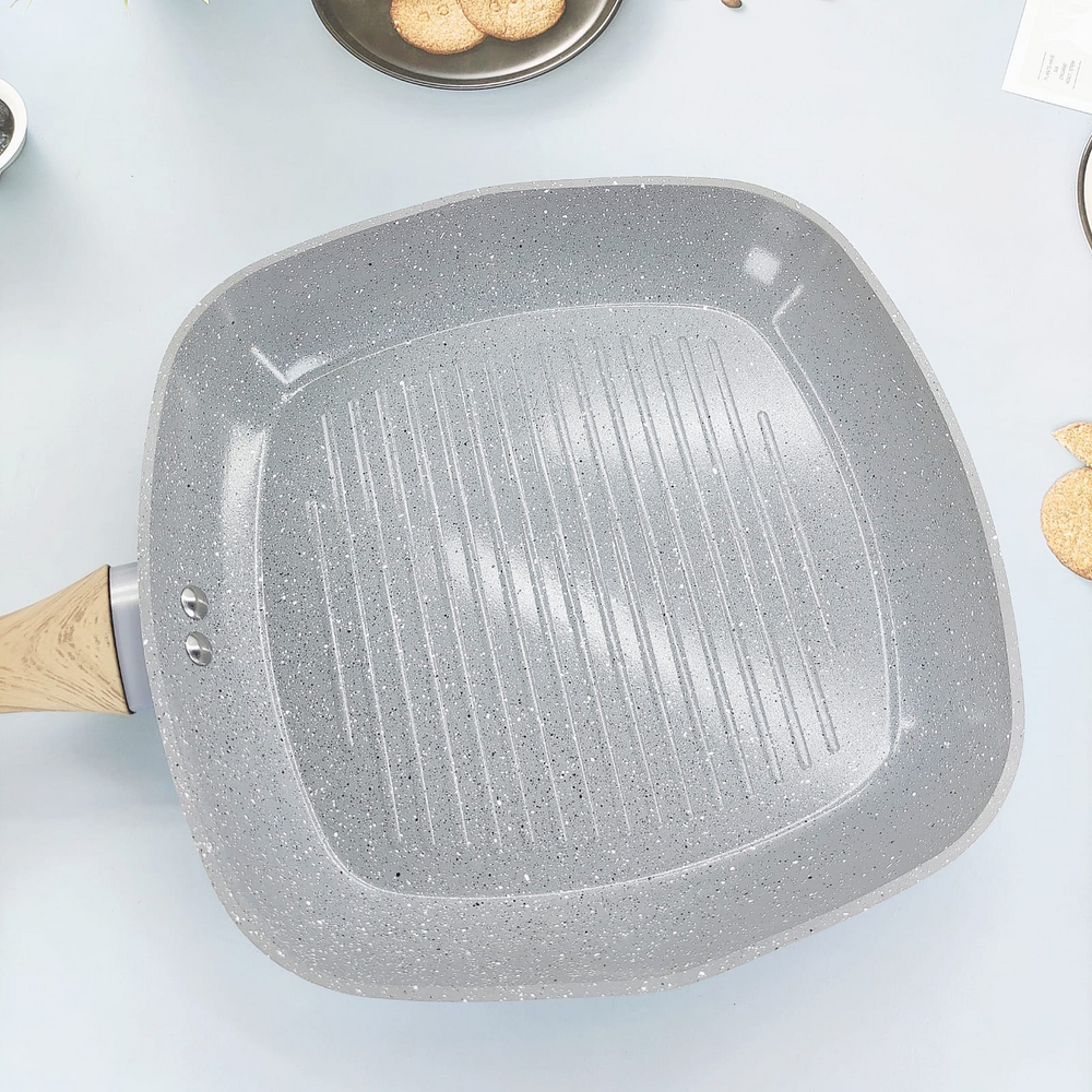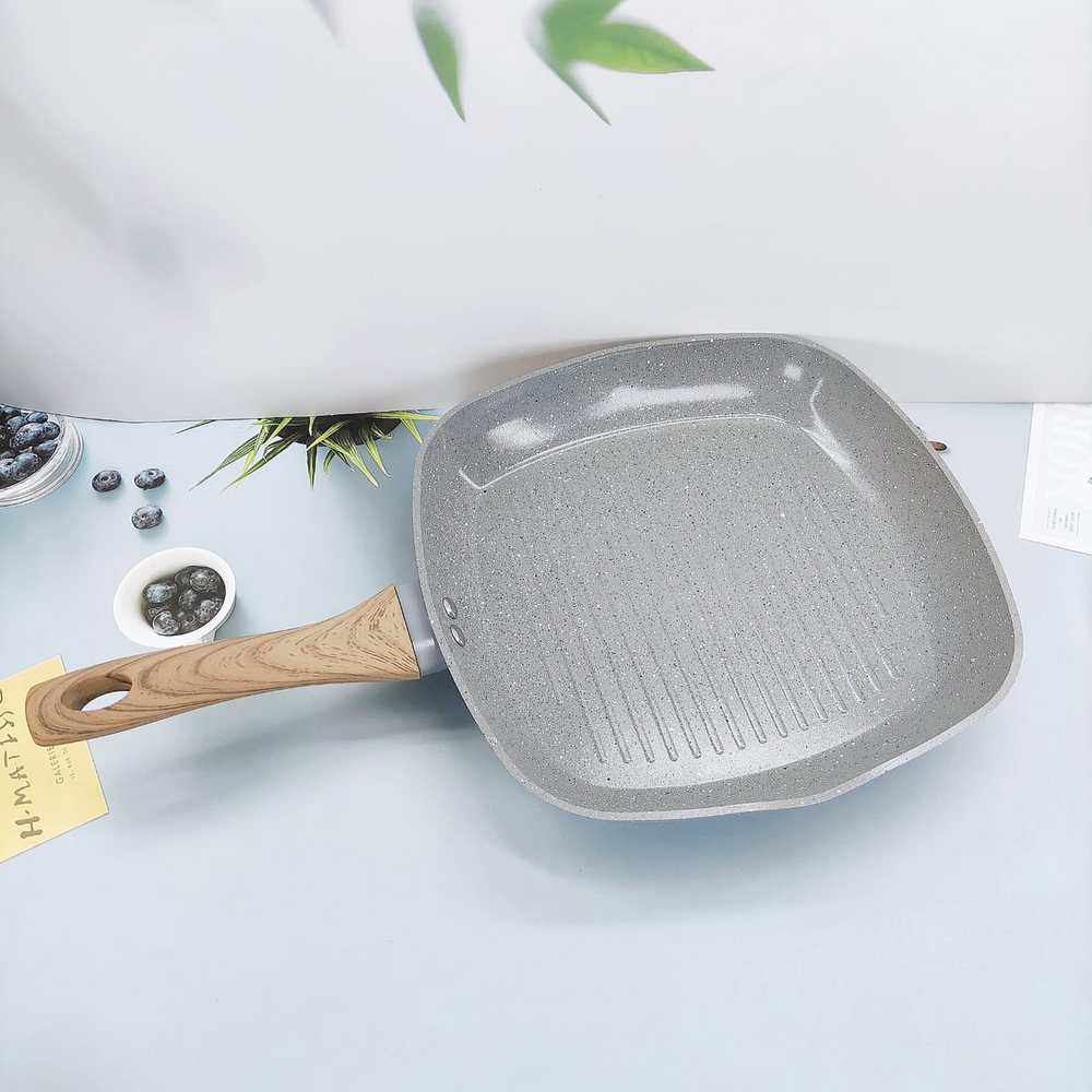(Bífera color gris de aluminio forjado con revestimiento antiadherente cerámico marca "Tego" y mango de baquelita recubierta con silicona antitérmica simil madera, la base de la misma cuenta con un sistema de espiral para una distribución rápida y uniforme del calor.)