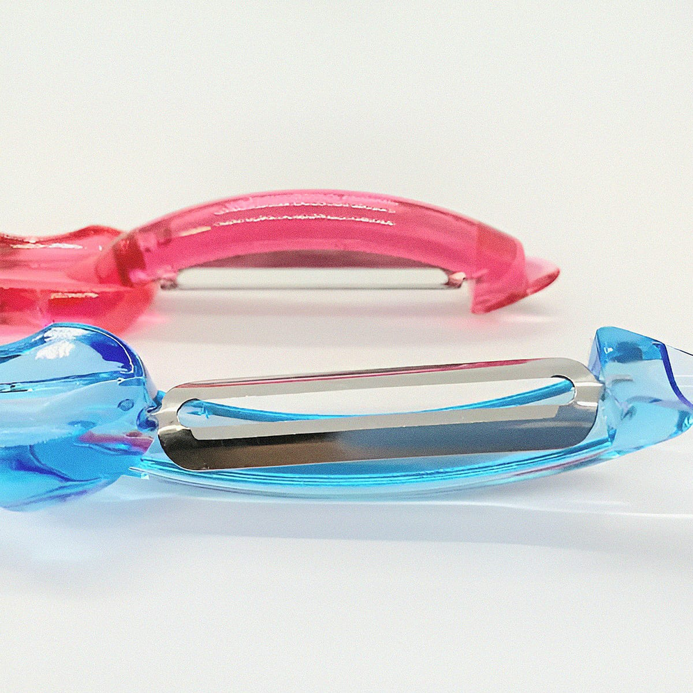(Pela papa vertical marca "Crystal Rock" Multifuncional con cuchillas de buen filo y punta en el costado para sacar malezas o raíces. Practico para pelar cualquier tipo de verduras y/o frutas. Este es de acero inoxidable y su mango de plástico. Cuenta con un orificio para guardar en donde desee).