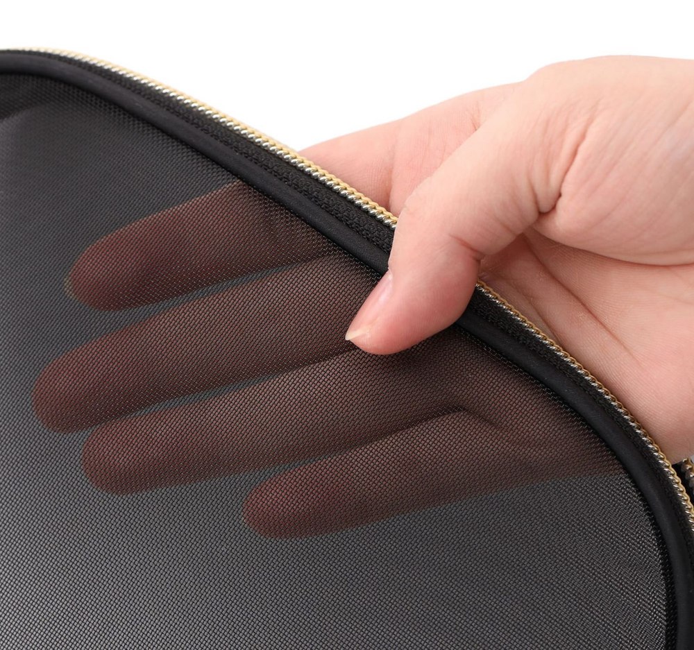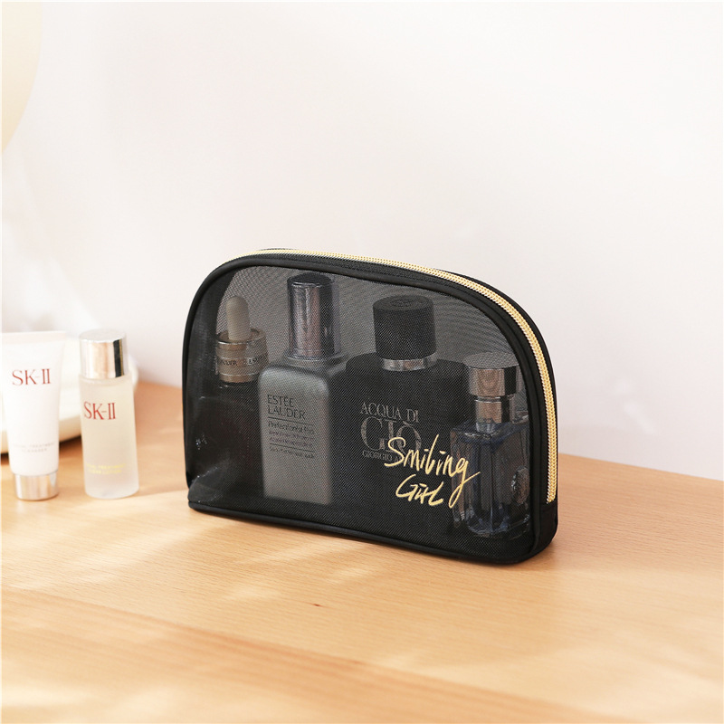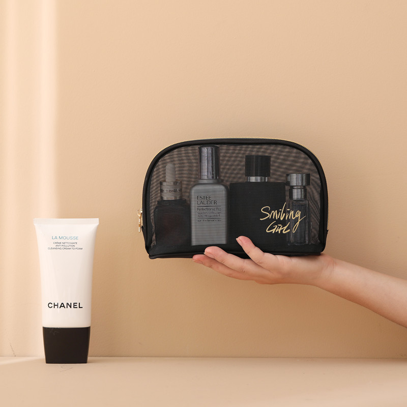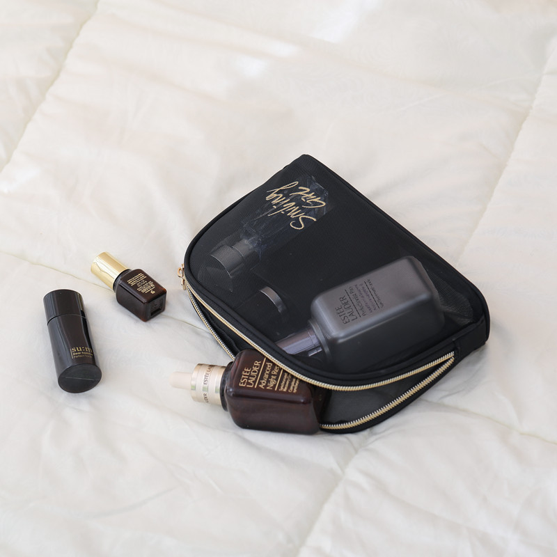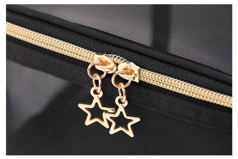 (Neceser de tela negra traslucida para poder ver su contenido, con cierre con estrella y frase en color dorado).