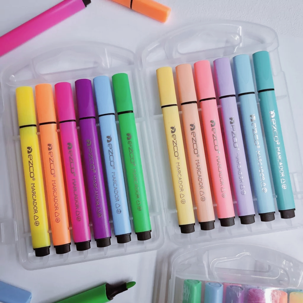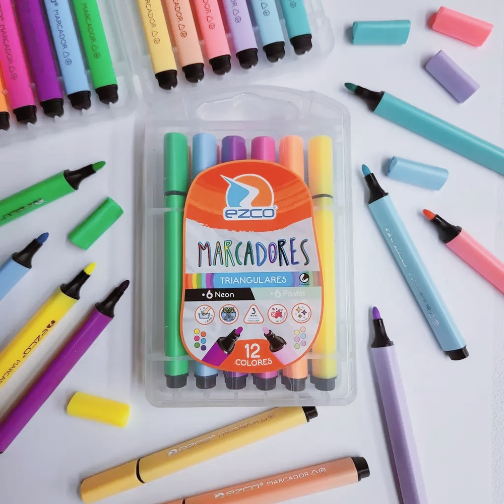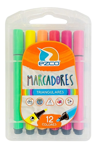 (Marcador Triangulares marca"Ezco" x 12 colores. Lavable, no tóxico, trazo suave 3mm, colores brillantes).