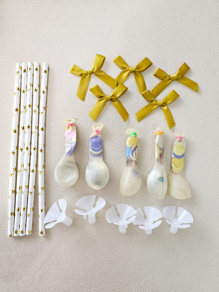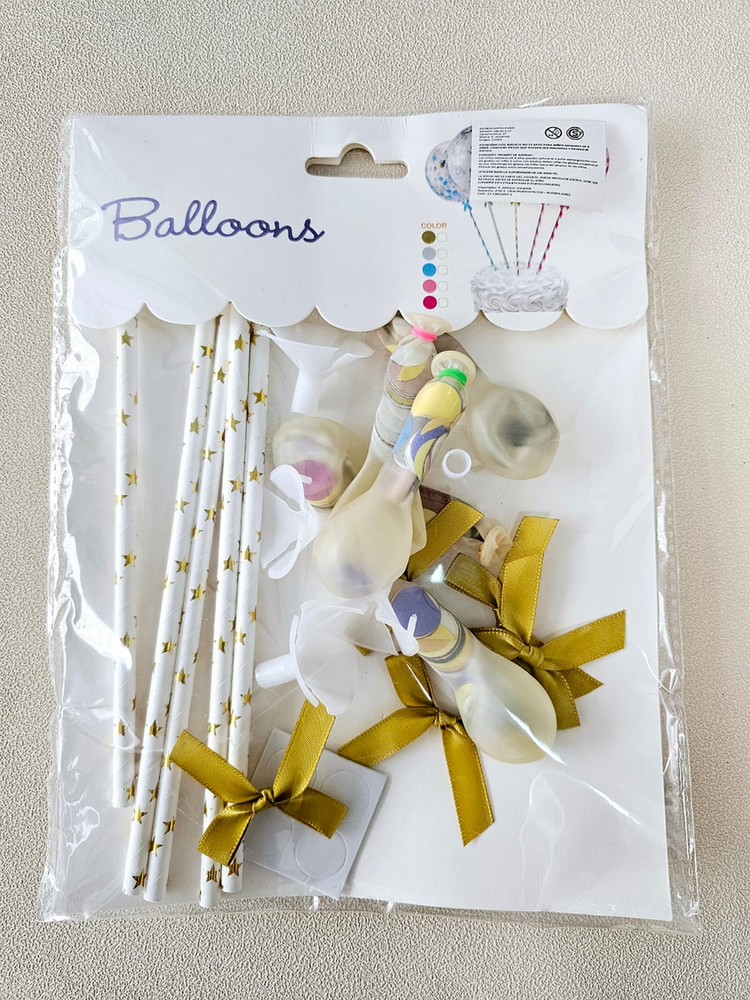 (Globos Decorativos para Fiestas 6 pulgadas vienen 5 globos con su palo y moño color dorado).