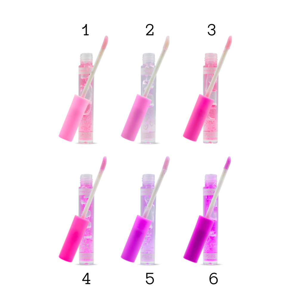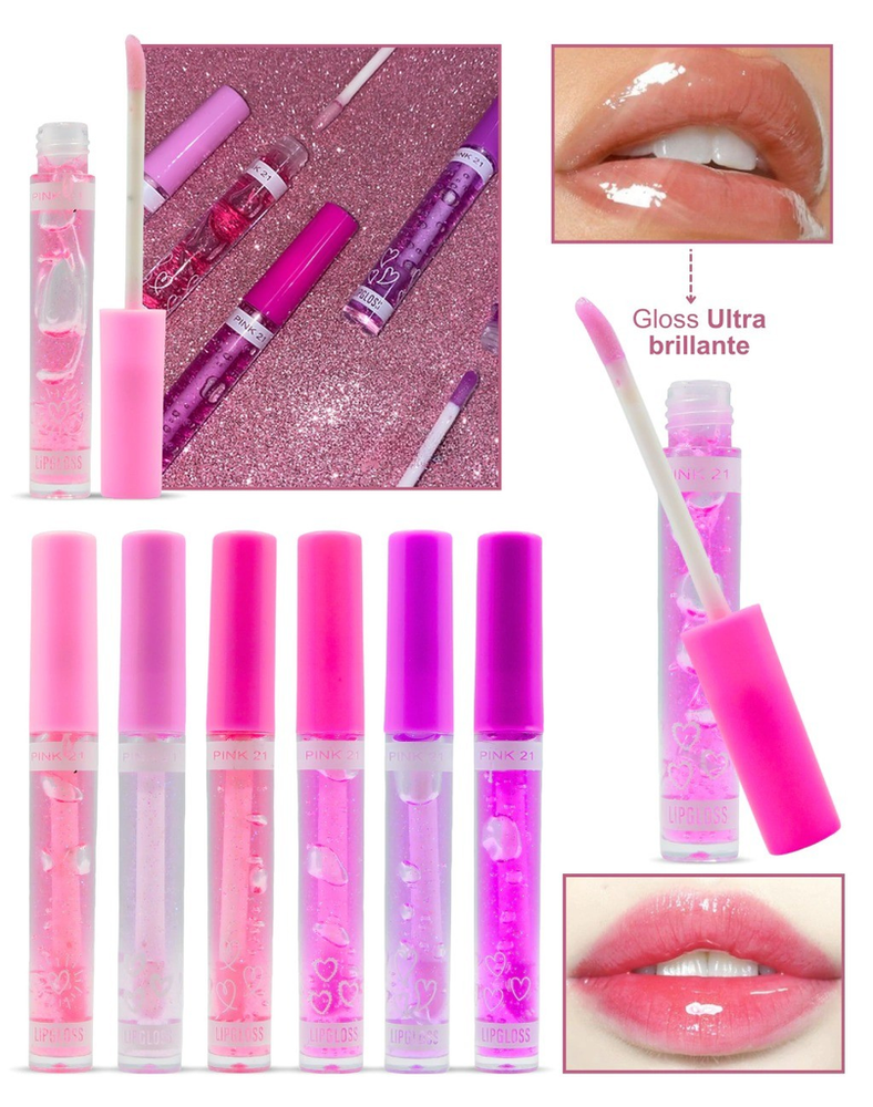 (Lipgloss ultra brillante "Pink 21". Variedad en 6 modelos a elección. Un acabado brillosos luciéndolos natural).