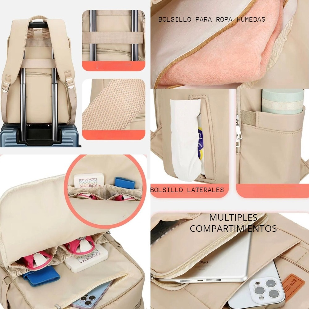 (Cuenta 2 bolsillos principales: 9 compartimentos en total (uno de ellos para ropa húmeda). En el exterior cuenta con 2 bolsillos laterales, 2 térmicos, 2 internos (uno con cierre y otro con botón a presión) y en la parte posterior tiene un acceso al bolsillo principal. Además tiene 2 tiras con abrojos para unir al carrito, 2 manijas y tiras acolchadas para mayor comodidad. Viene en 4 colores distintos a elección).