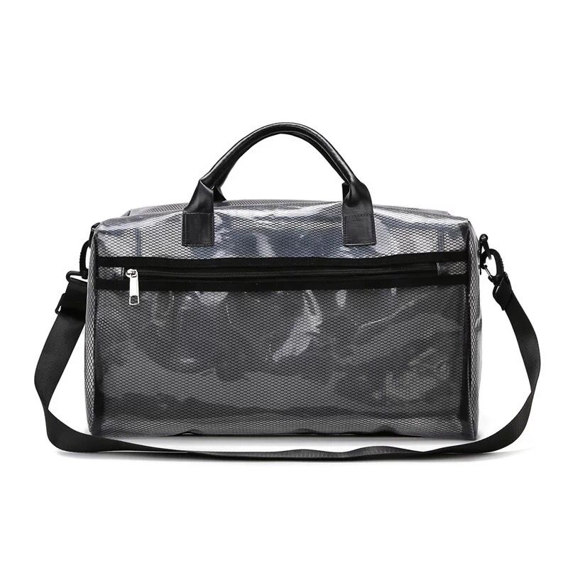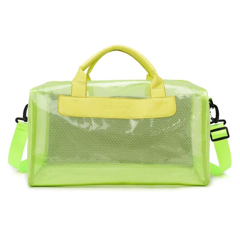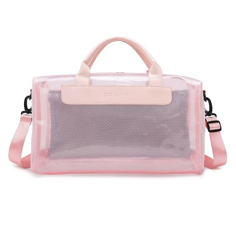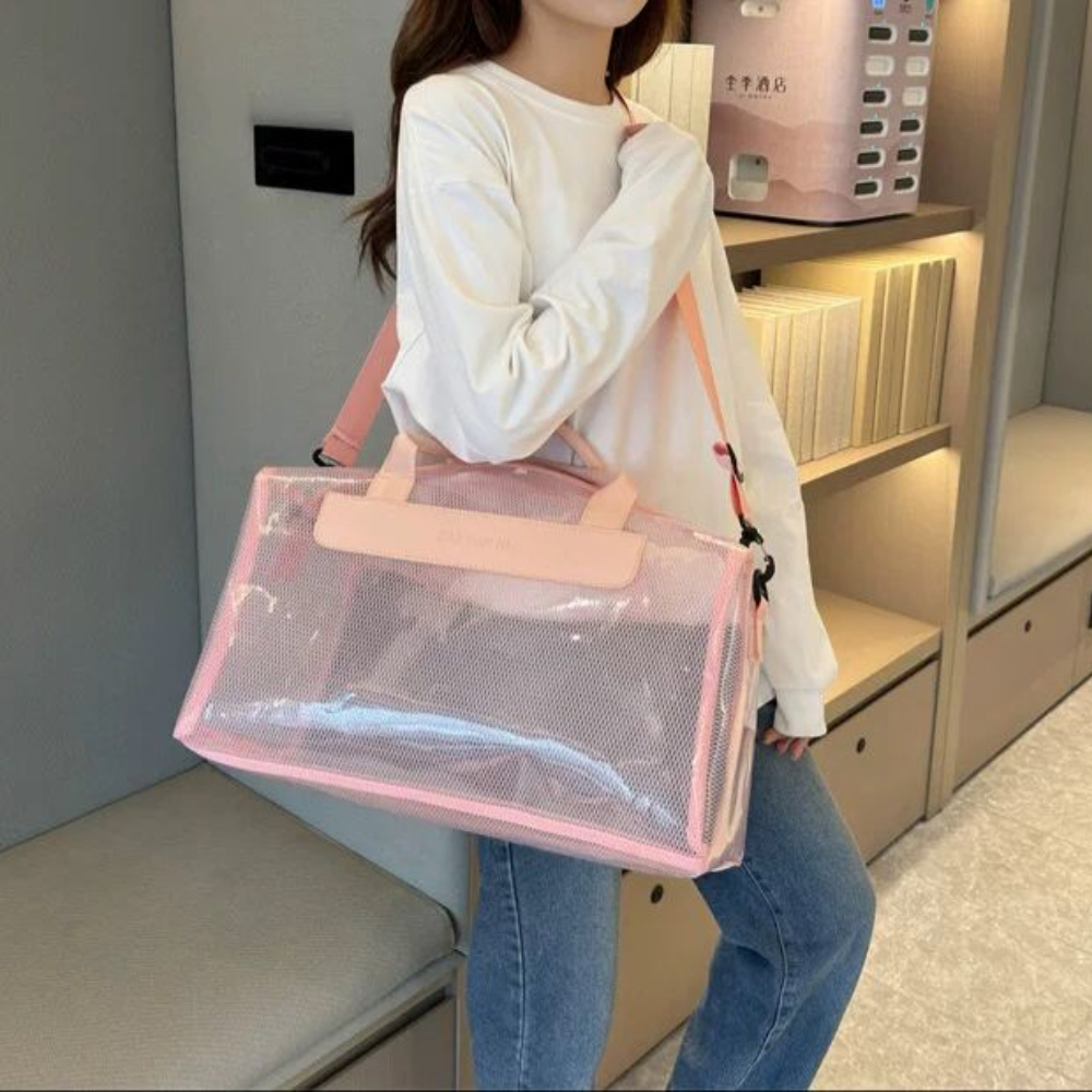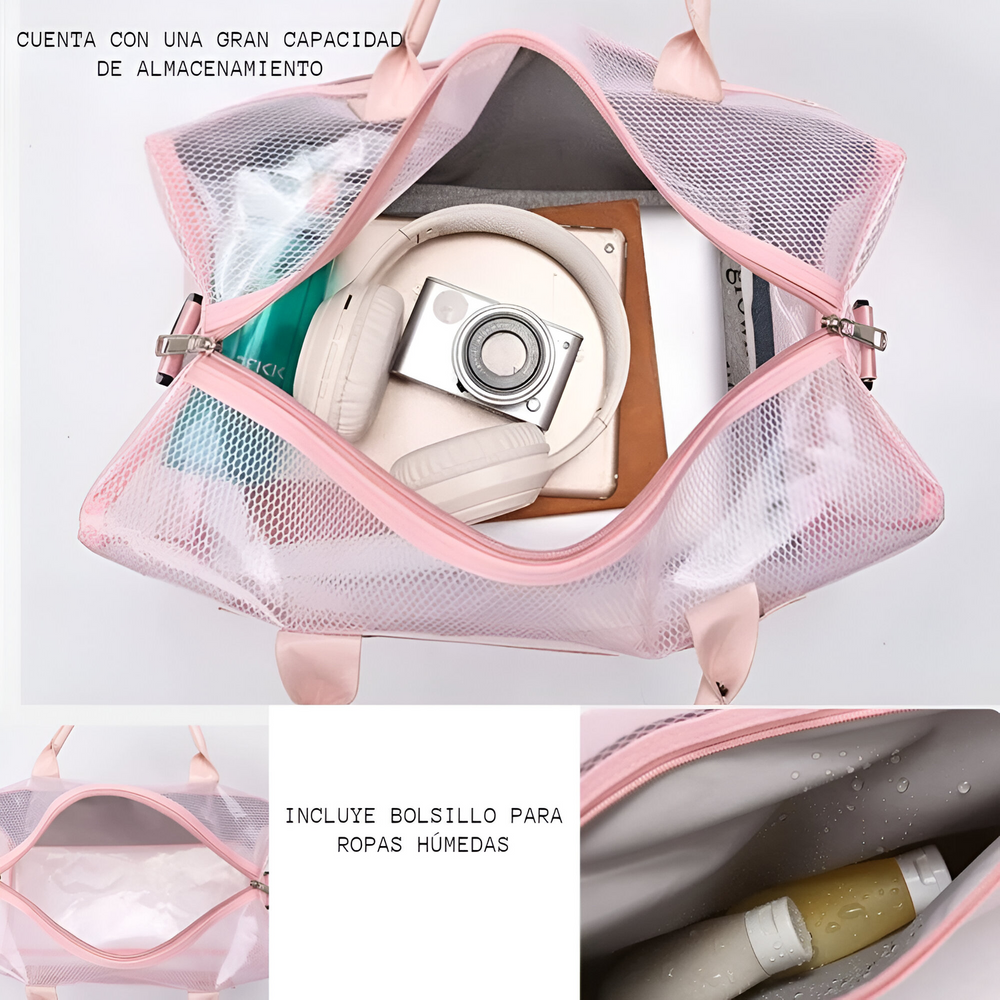 (Bolso impermeable con diseño de red. Cuenta con un bolsillo principal, un bolsillo secundario sin transparencia, dos manijas y una correa. Ideal para la playa).