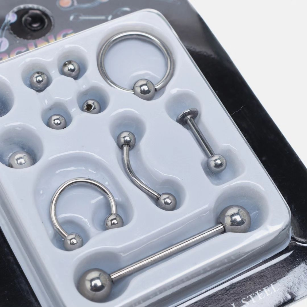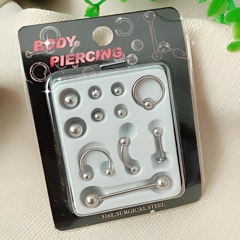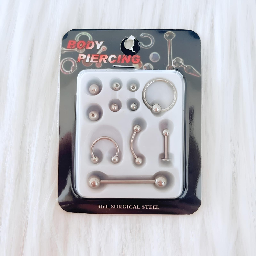 (Set de Piercing de acero quirurgico, viene pelotitas de diferentes tamaños como repuesto).