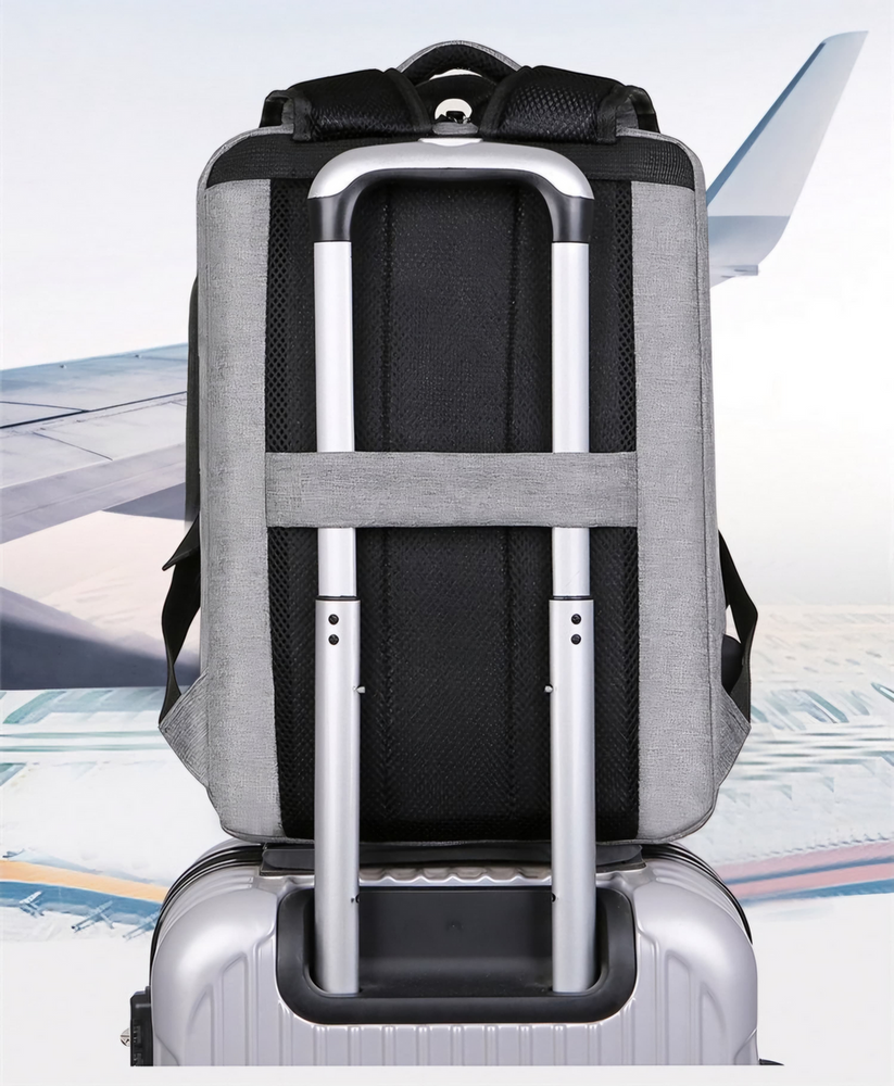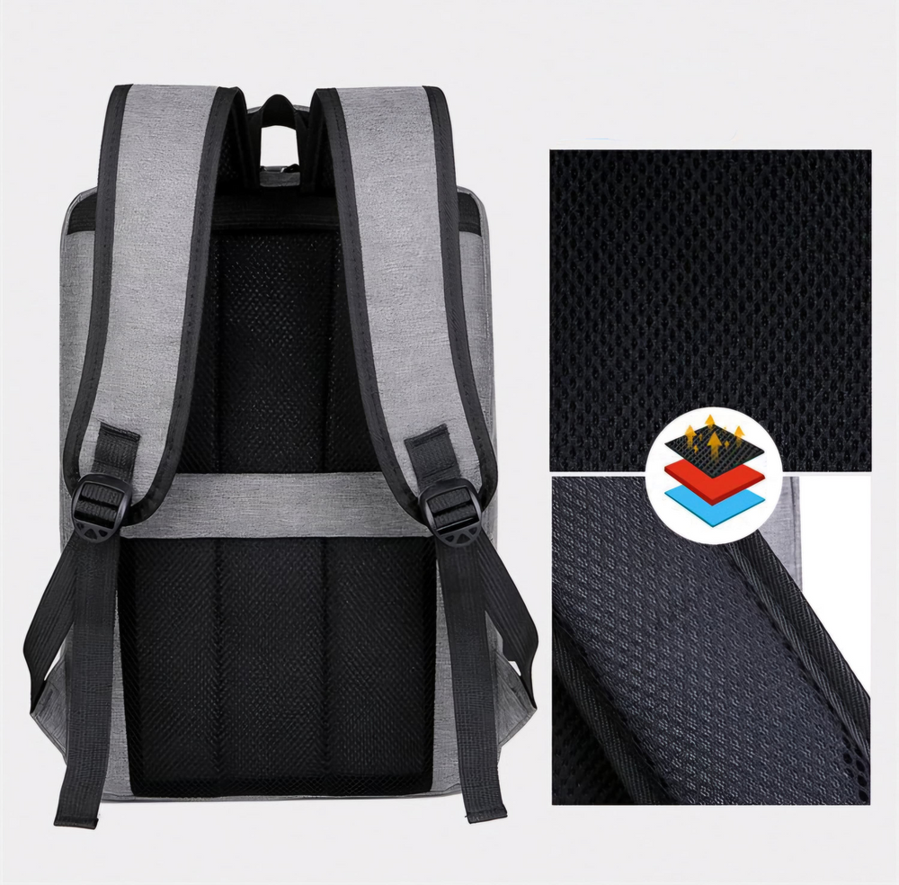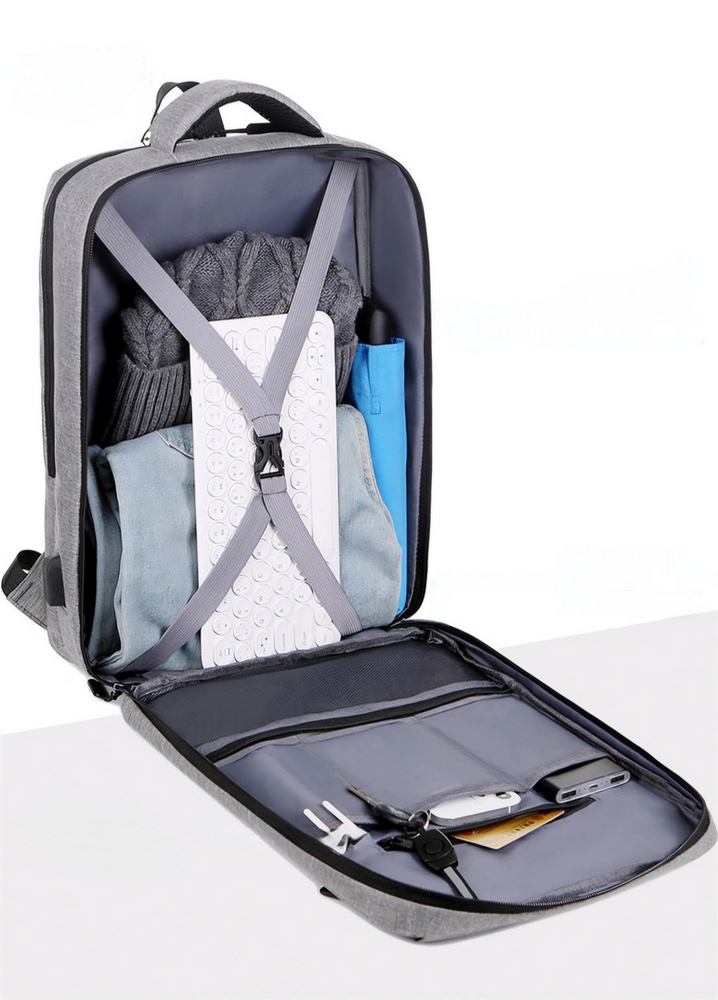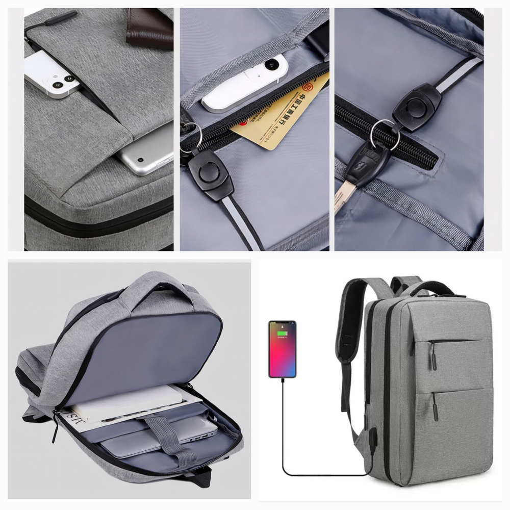 (Cuenta con 2 compartimentos principales: El primero posee 2 bolsillos internos (mallado y estándar), 3 divisiones para objetos, un cable USB, tiras para ajustar y un llavero. El segundo compartimento posee un bolsillo amplio con sujetador. Por último, en la parte frontal de la mochila, cuenta con 2 bolsillos con gran capacidad y un bolsillo lateral. Sus tiras son acolchadas y ajustables. Ideal para usar como equipaje de mano para un viaje).