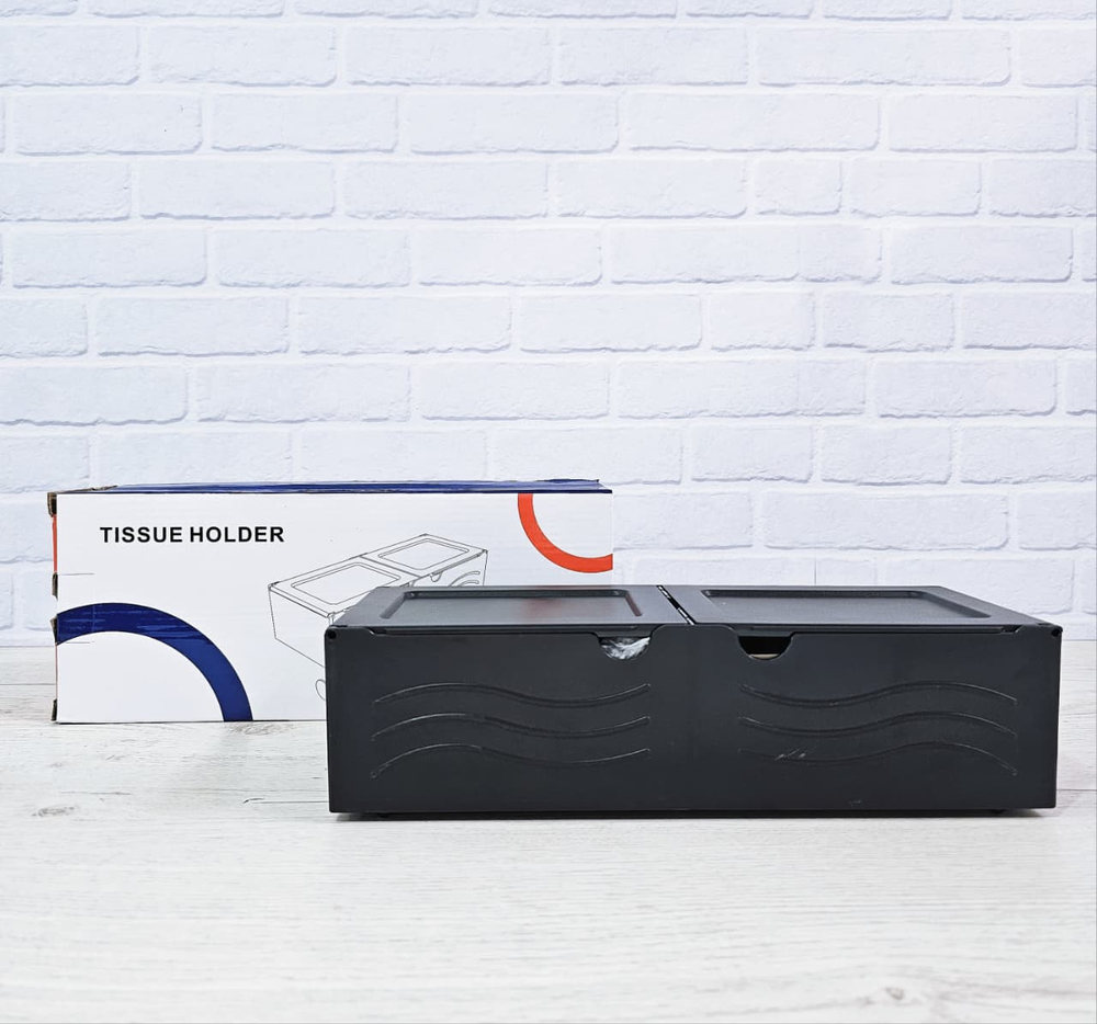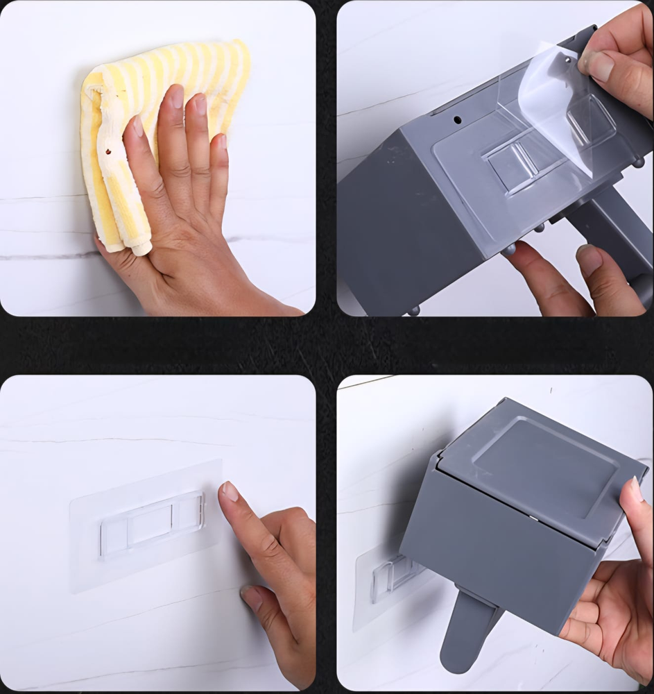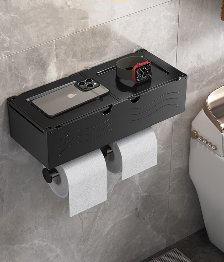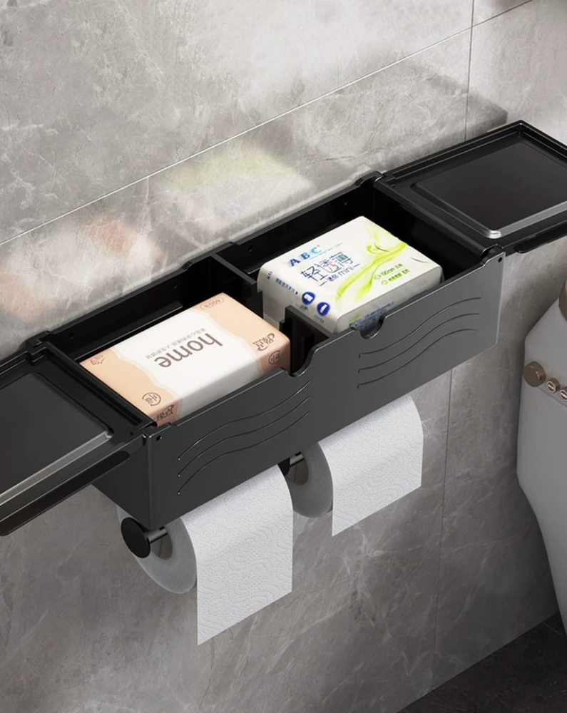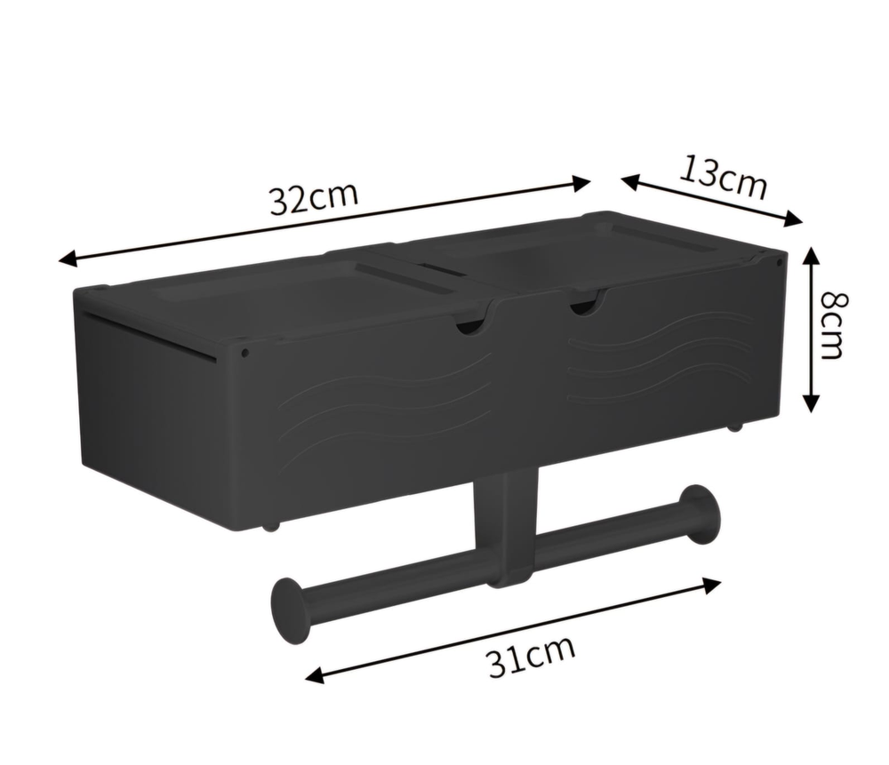 (Cuenta con 2 portarrollos y 2 compartimentos multiuso. Trae consigo gancho adhesivo para colocar en superficie liso. Ideal para almacenar, productos de higiene femenino, aromatizantes, pañuelos, etc).