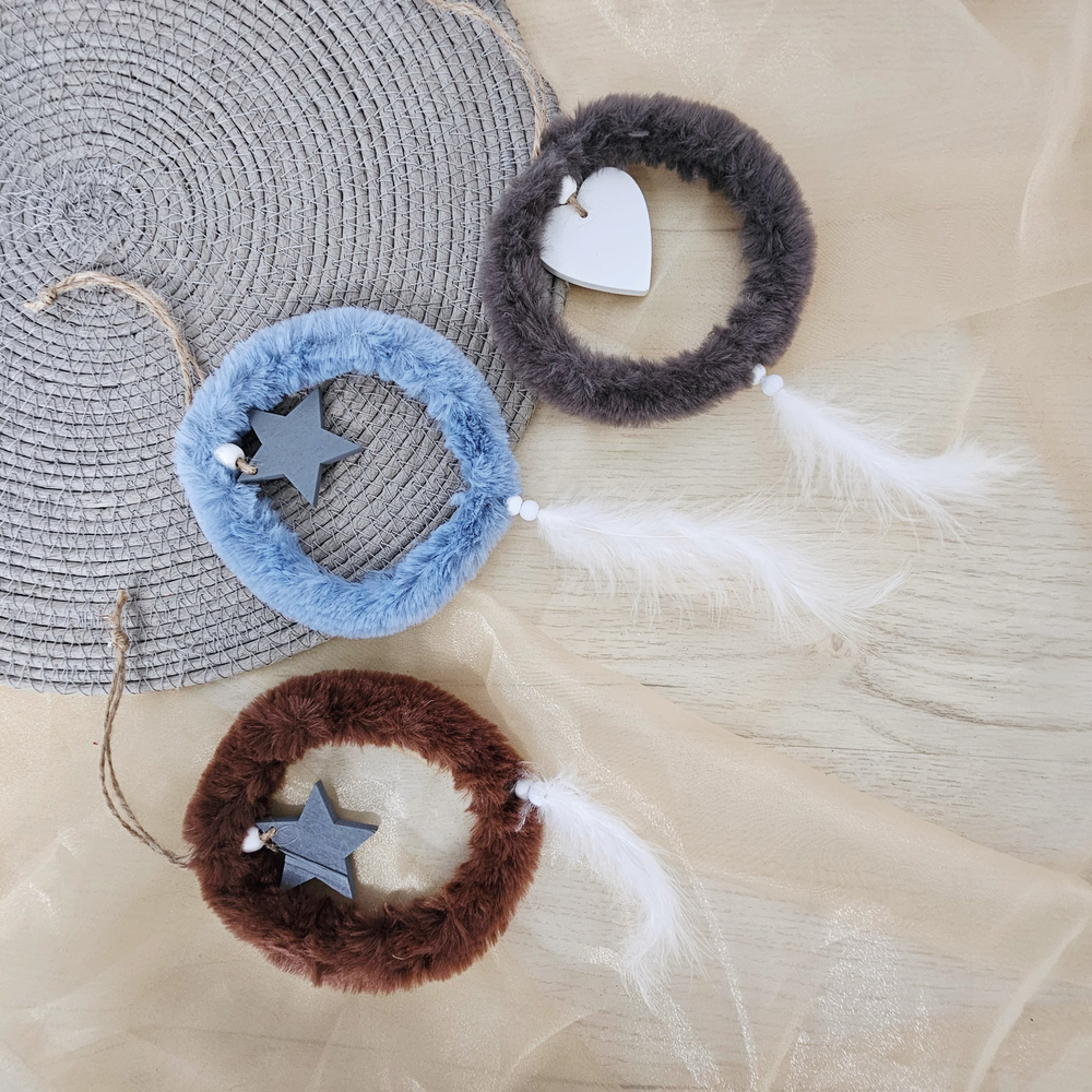 (Cuenta con un diseño circular con una pluma, un accesorio de estrella o corazón en el centro y un sujetador para colgar donde más te guste. Ideal para decorar tu hogar).