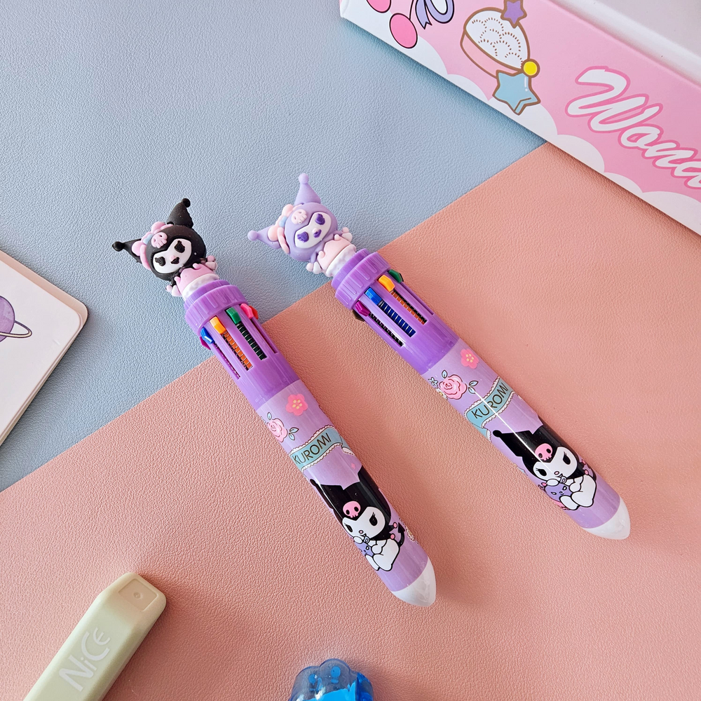(Cuenta con un diseño temático de "Kuromi" el cual tiene un mecanismo retráctil con 10 colores diferentes y un muñeco de "Kuromi" en la parte superior. Ideal para uso escolar).
