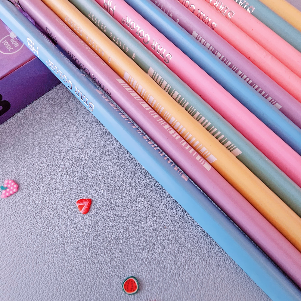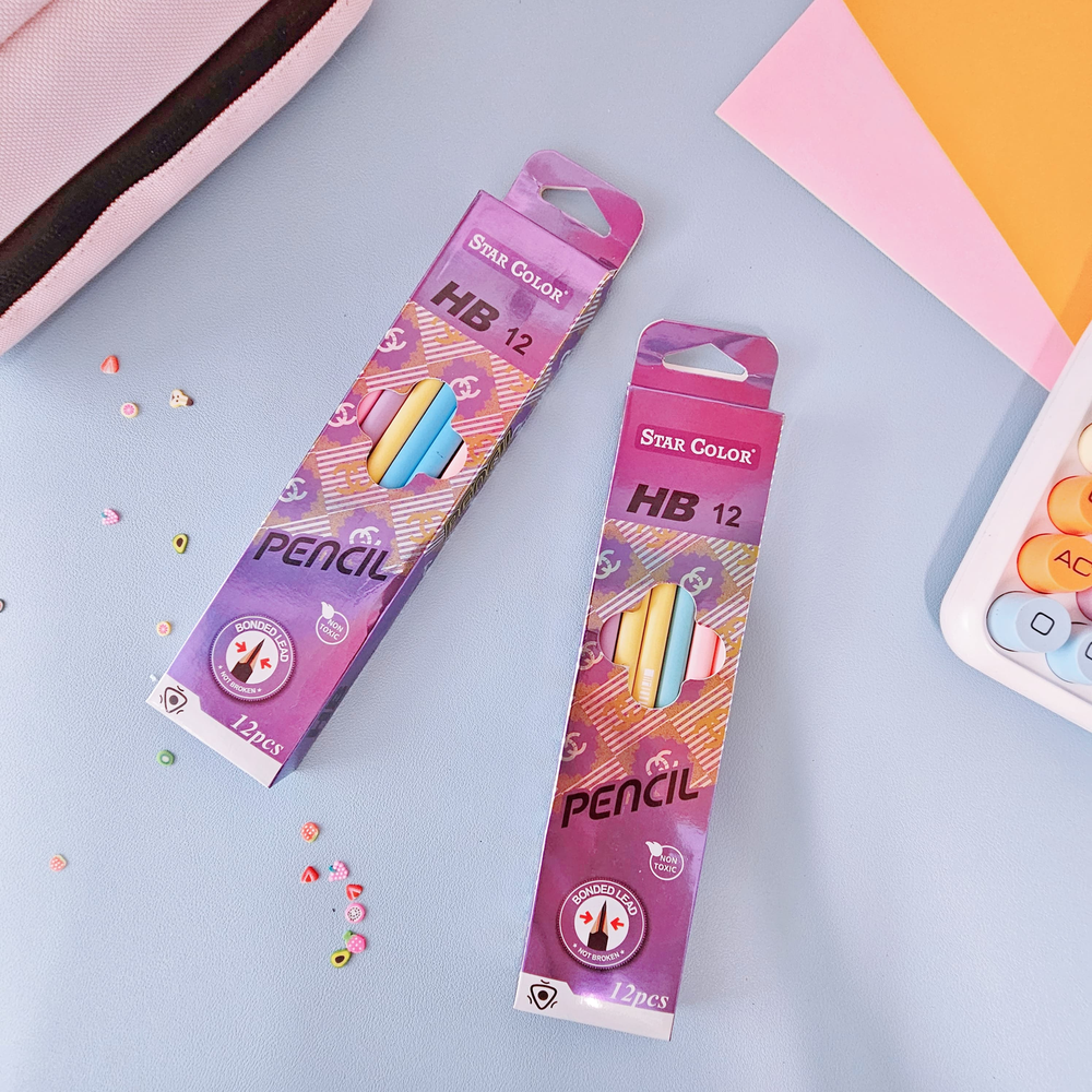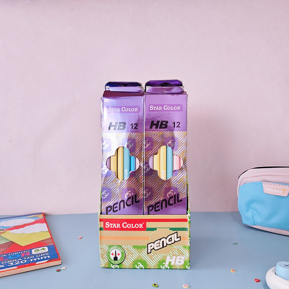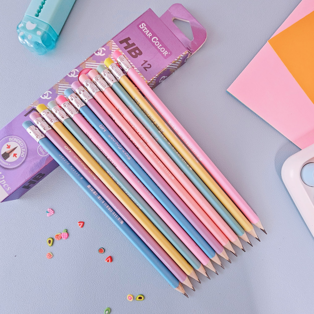 (Caja x 12U. Lápiz Negro con Goma de borrar con un lindo diseño en colores pastel. Ideal para el colegio).
