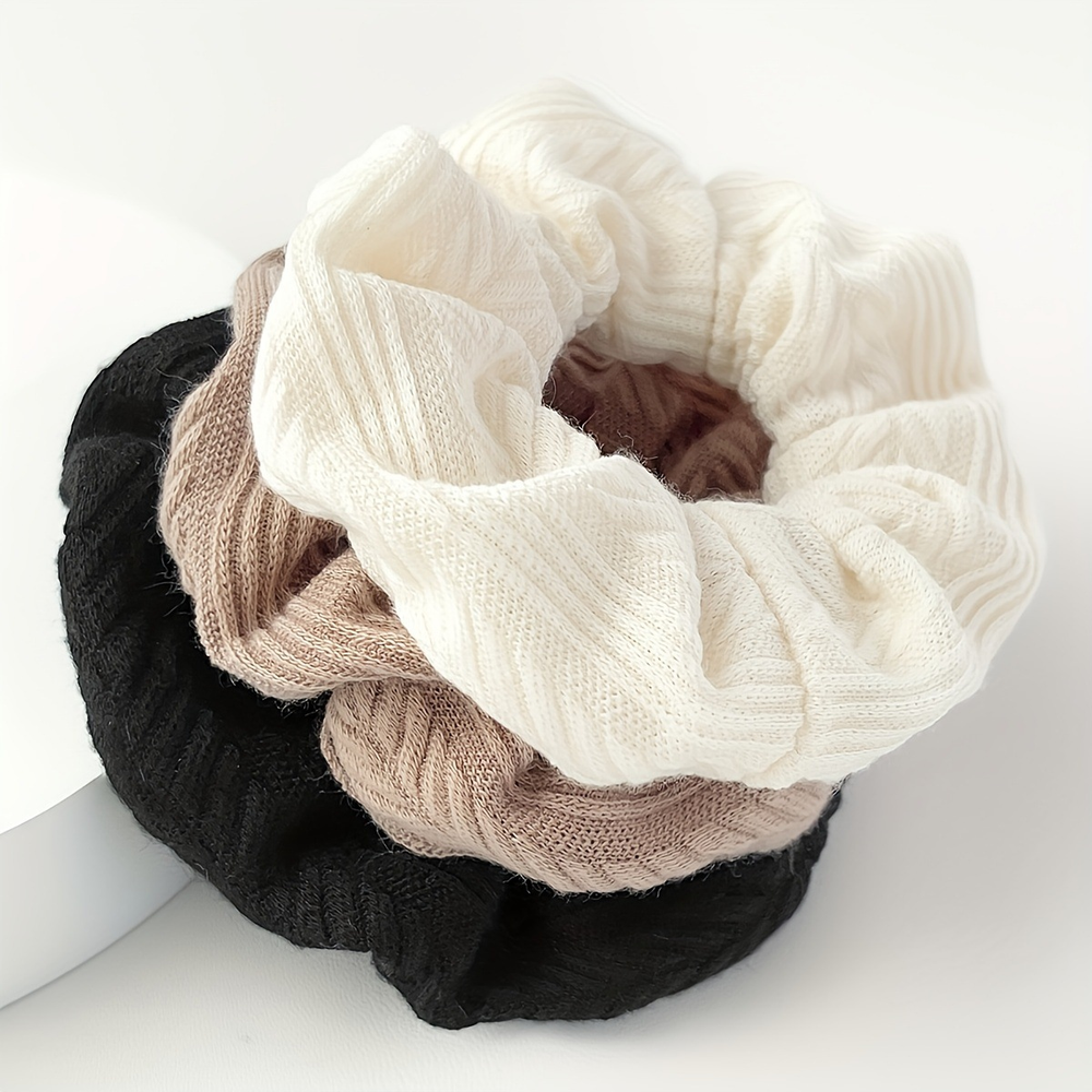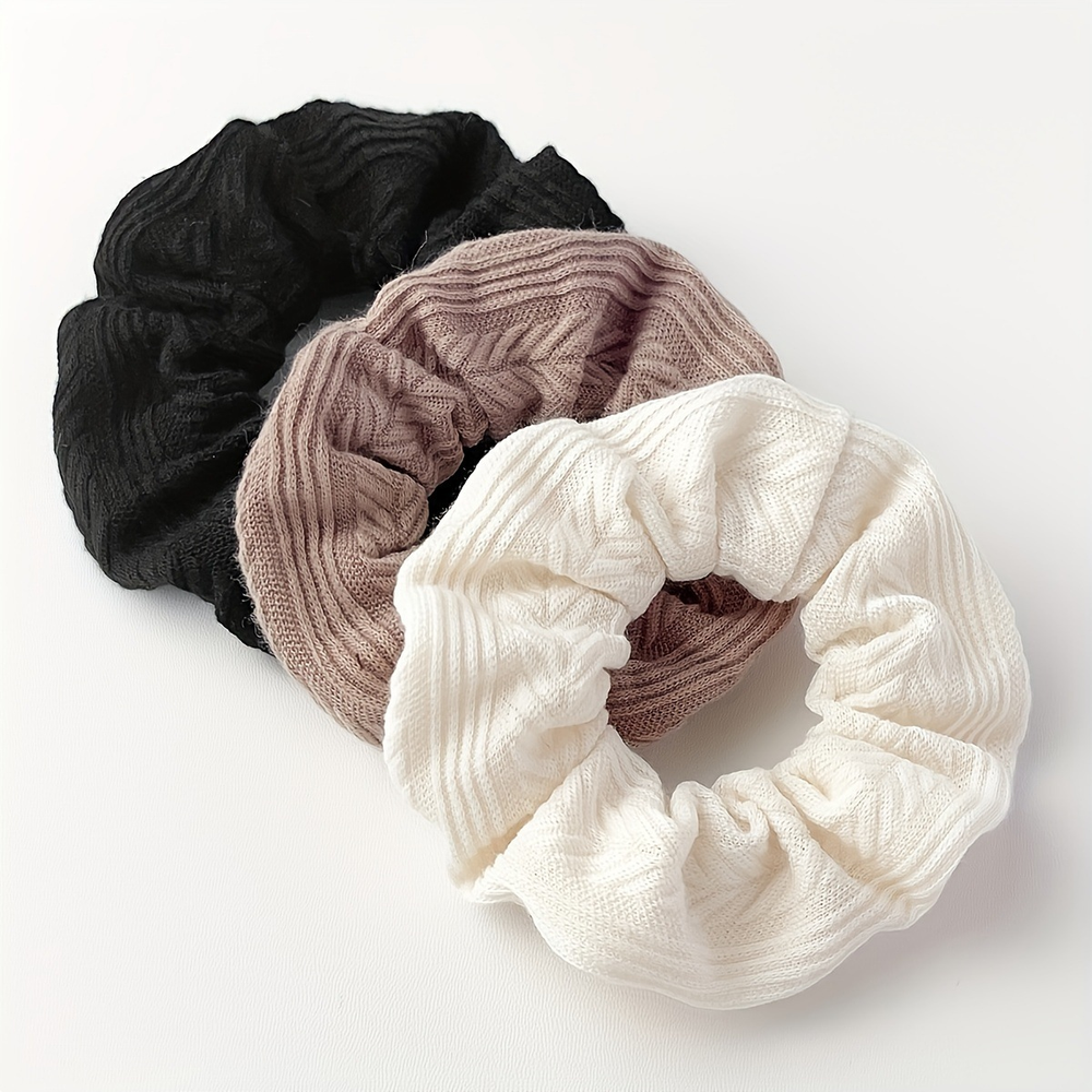 (Scrunchies para el cabello. Cuenta con 3 colores diferentes. Su elasticidad y colores hacen posible que se adapten a cualquier tipo de peinado).