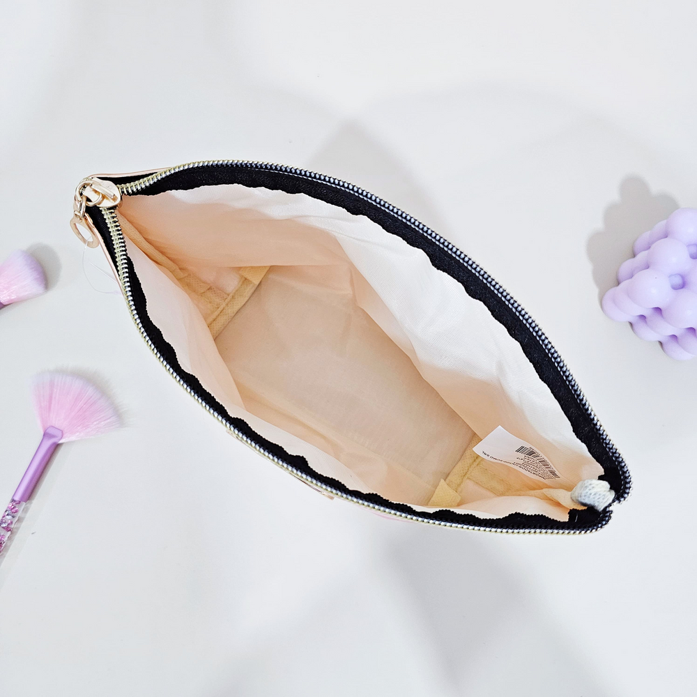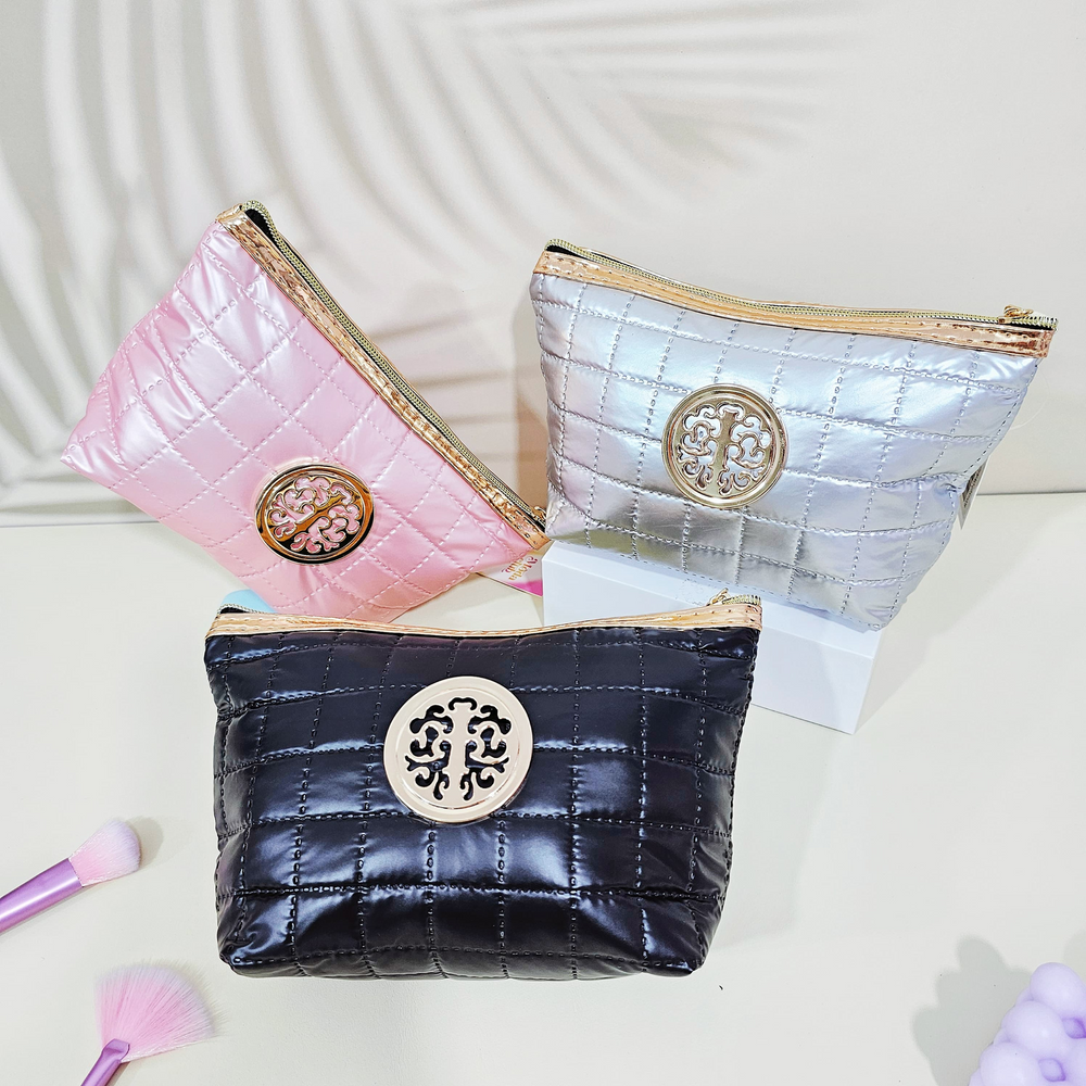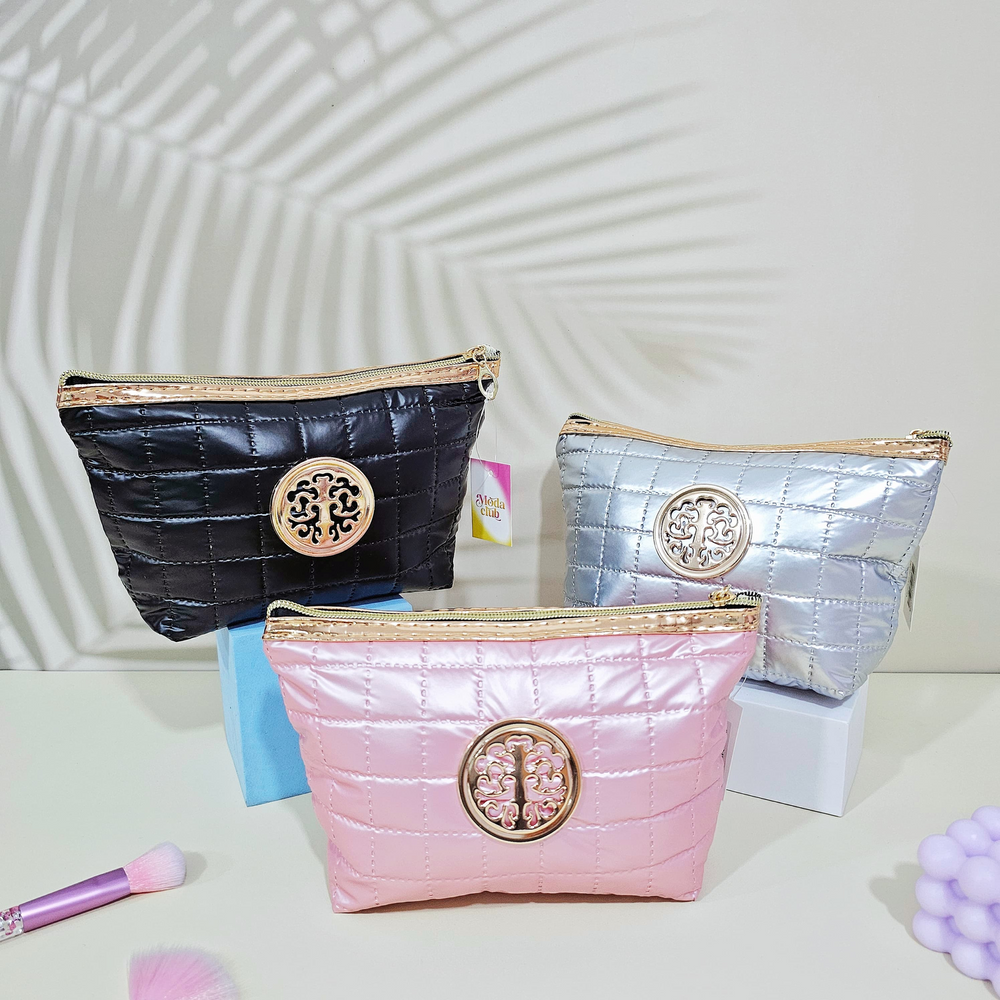 (Neceser de tela, cuenta con un compartimiento principal amplio, cierre dorado y un dije en el centro. Ideal para guardar accesorios, maquillaje, etc. Disponible en 3 colores).