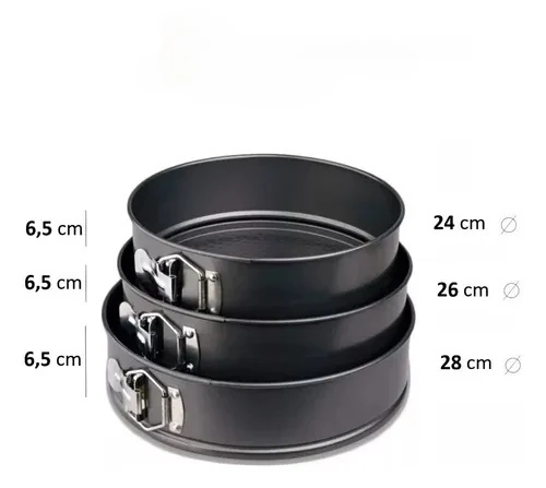 (Set de moldes para tortas teflonados, de medidas distintas, con forma circular, Fácil desmoldado: la hebilla proporciona una liberación rápida de productos horneados. un manejo fácil y un cierre preciso. El pestillo de resorte y el dispositivo de enclavamiento que se mantienen firmemente unidos y ofrecen un sello hermético a prueba de fugas. los moldes para pasteles son apilables para ahorrar espacio, ideales para crear pasteles de una, dos o incluso tres capas para todo tipo de celebraciones).