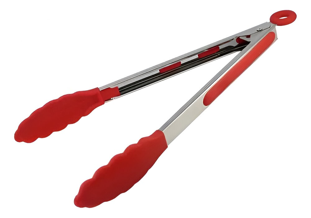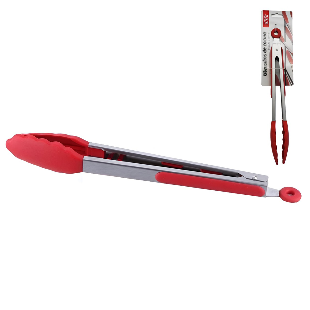 ( Esta pinza tiene mango de plástico y acero, puntas de silicona y traba para abertura. Es perfecta para servir ensaladas y otros platillos de manera cómoda y eficiente. Su diseño es elegante y funcional).
