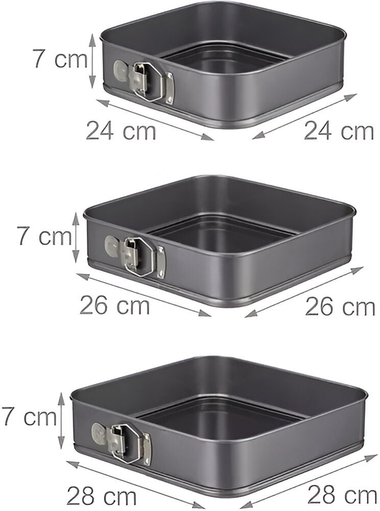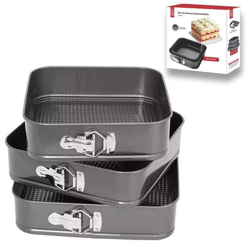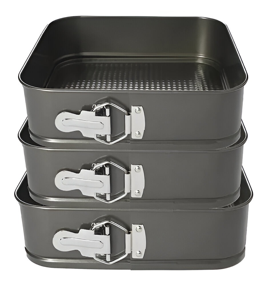 (Set de moldes para tortas teflonados, de medidas distintas, con forma cuadrada , Fácil desmoldado: la hebilla proporciona una liberación rápida de productos horneados. un manejo fácil y un cierre preciso. El pestillo de resorte y el dispositivo de enclavamiento que se mantienen firmemente unidos y ofrecen un sello hermético a prueba de fugas. los moldes para pasteles son apilables para ahorrar espacio, ideales para crear pasteles de una, dos o incluso tres capas para todo tipo de celebraciones).