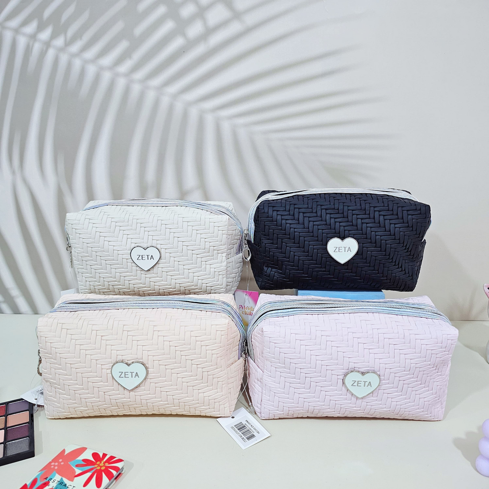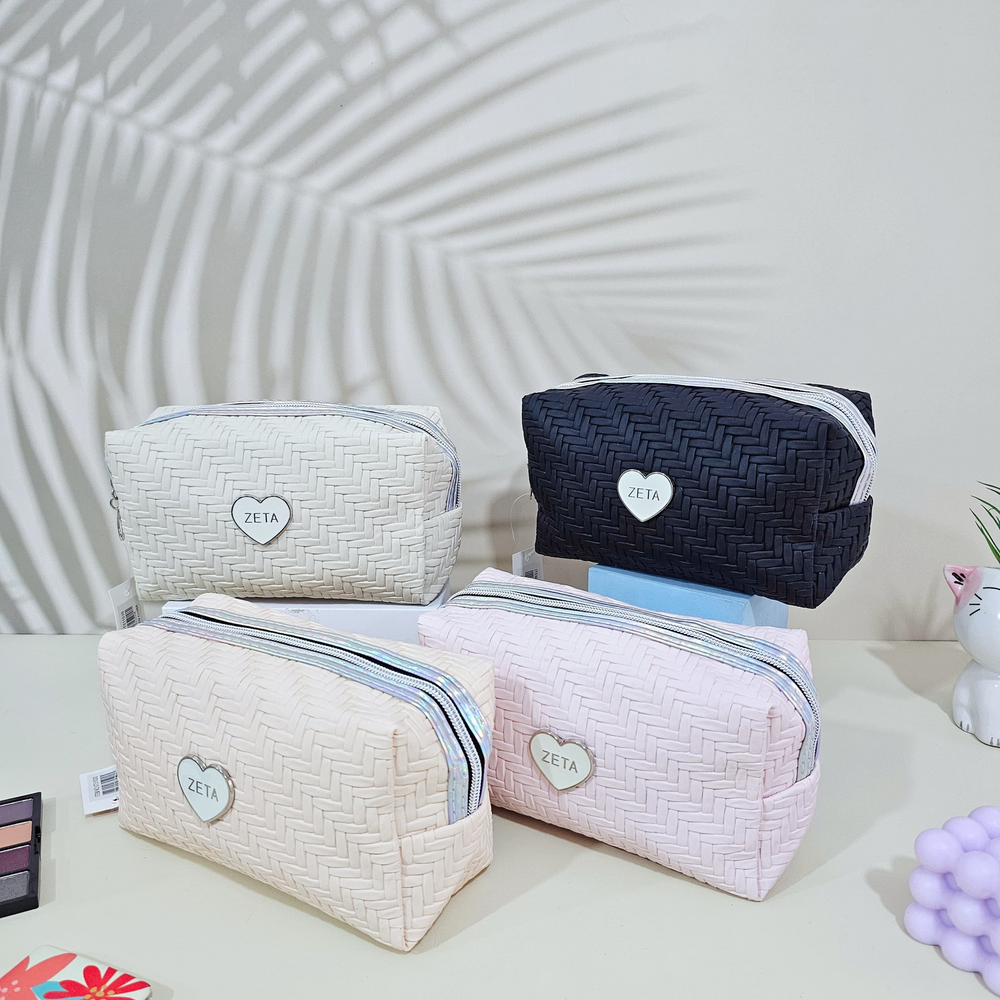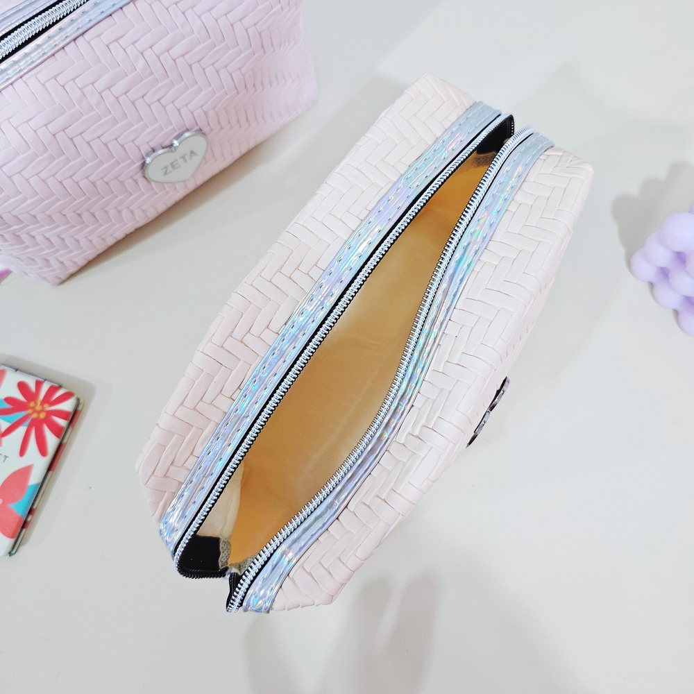 (Portacosmetico con un compartimiento amplio, cierre holográfico y dije en forma de cerrazón . Ideal para guardar accesorios, maquillaje, etc. Disponible en 4 colores).