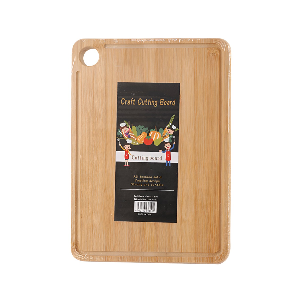 (Tabla para picar de madera mediana grande con forma rectangular sus puntas redondeadas y además cuenta con un agarradera para sujetarla).