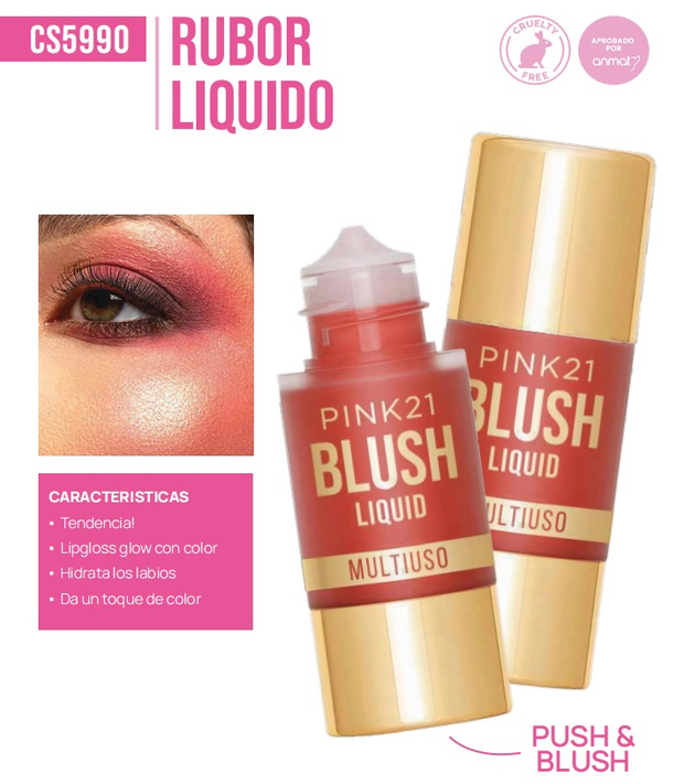 (Rubor Liquido "Pink 21", cuenta con 6 opciones a elección, es ideal para que tu maquillaje quede perfecto, dejando un tono único en tu piel y de una forma natural).