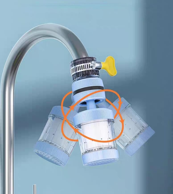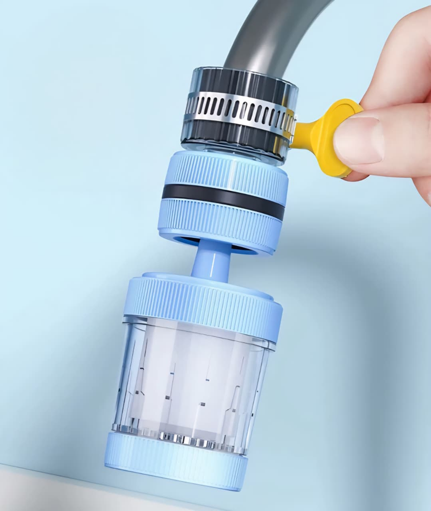 (Es un filtro de agua para grifo que se puede rotar 360 grados. Se utiliza para purificar el agua del grifo, eliminando sedimentos, impurezas, bacterias y otros contaminantes. Los purificadores de agua son importantes para la salud, ya que garantizan que el agua que se consume sea segura y saludable. Este tipo de filtro de agua se puede utilizar en el hogar, la oficina, etc).