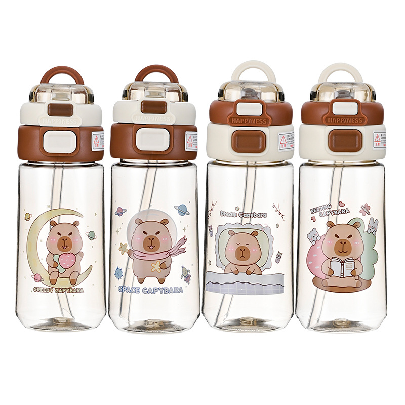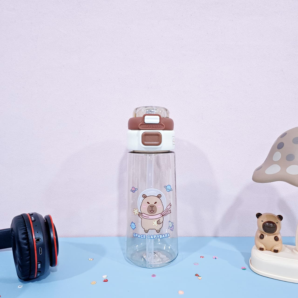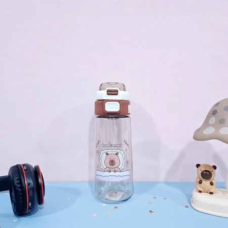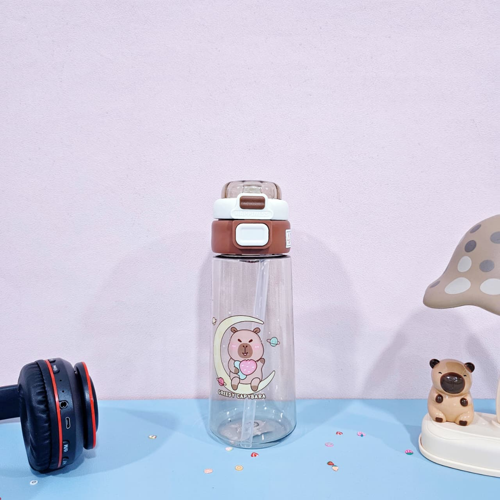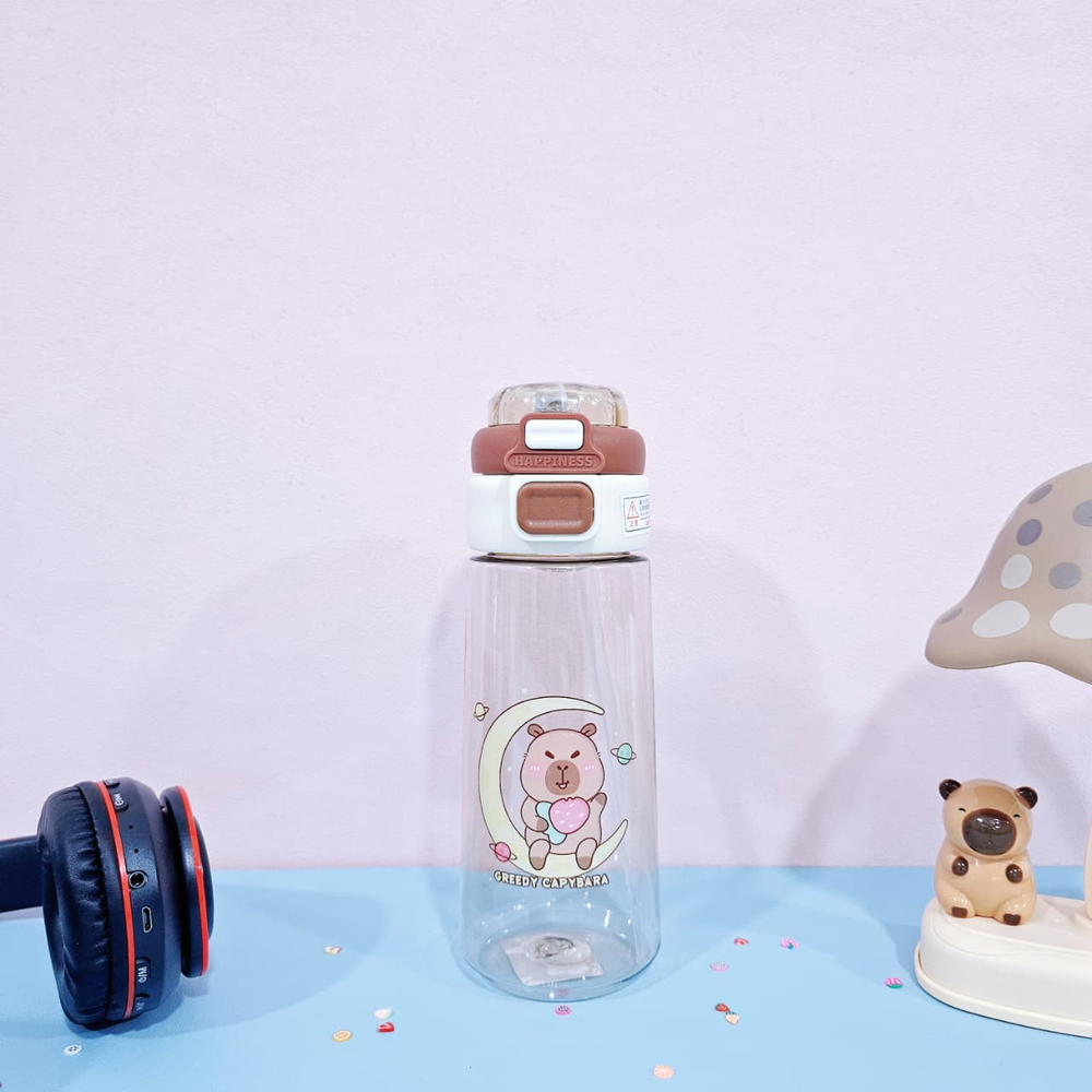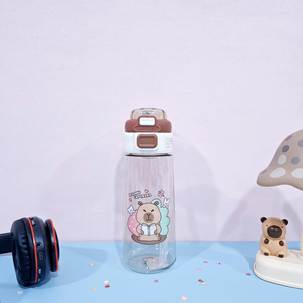 (Botella de agua dobre pico uno vertedor y otro con sorbete. Diseño con dibujos de capybara ,es transparente lo que permite ver el contenido. Ideal para niños o para quienes buscan una botella de agua divertida y con estilo. Cuenta con sorbete y manija ).
