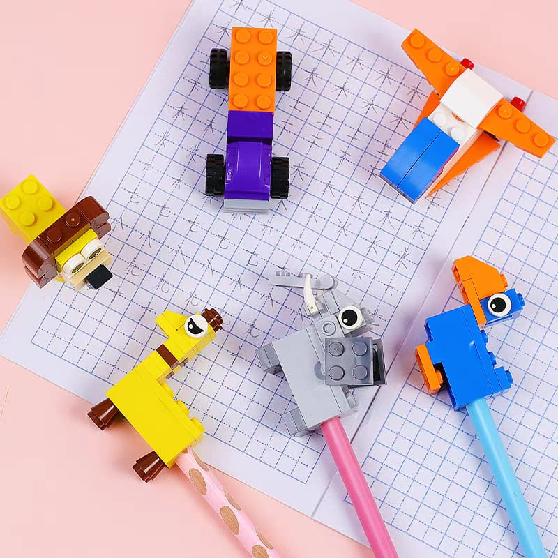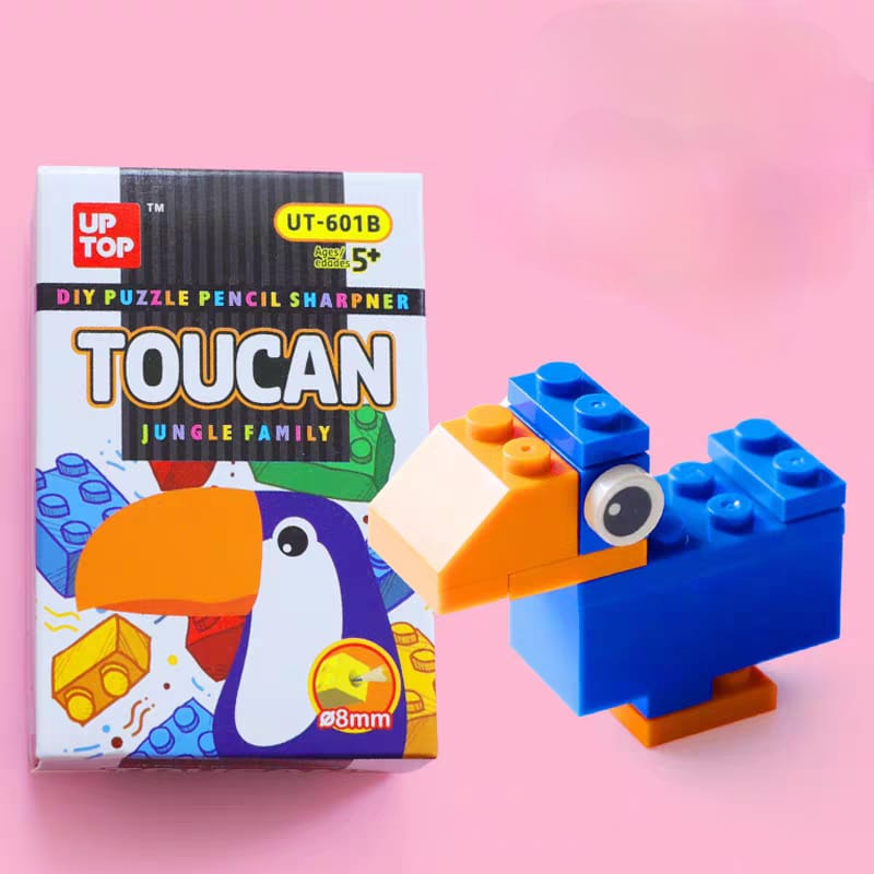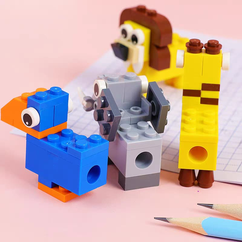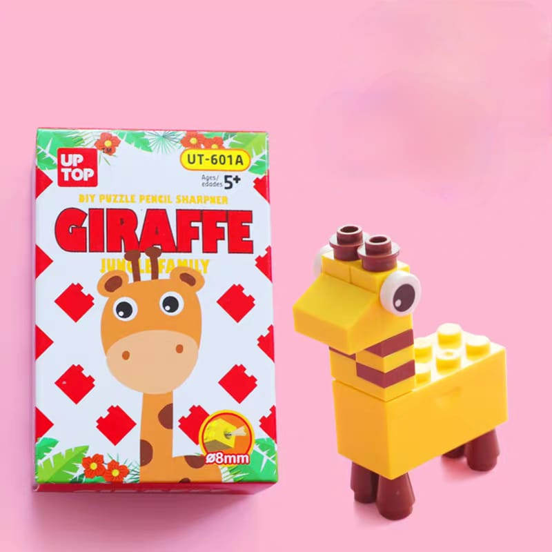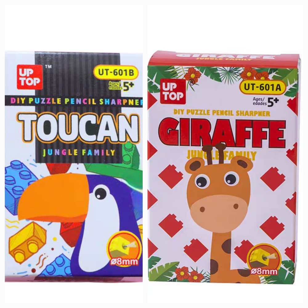 (Caja con 24 unidades de sacapuntas con forma de jirafa y tucán tipo Legos).