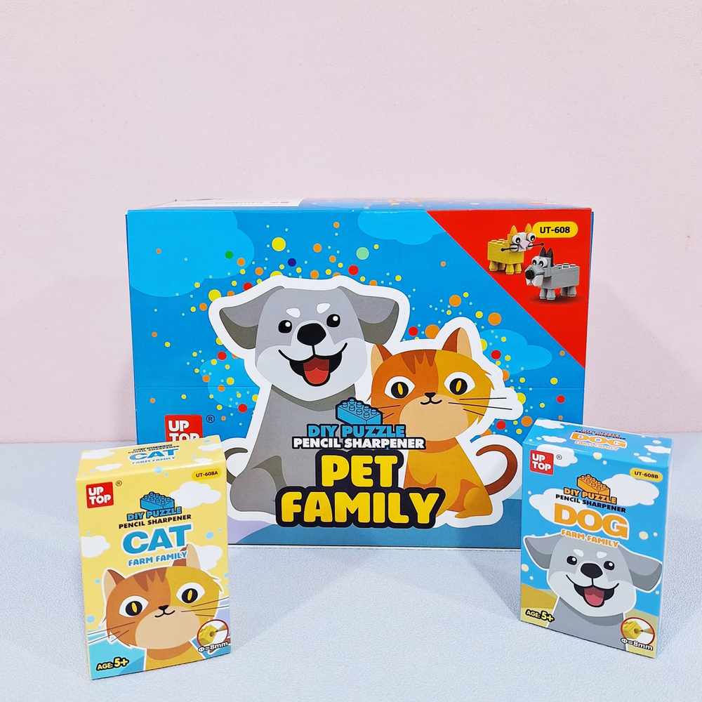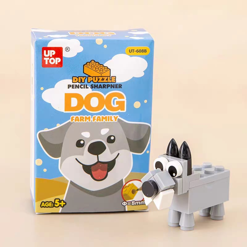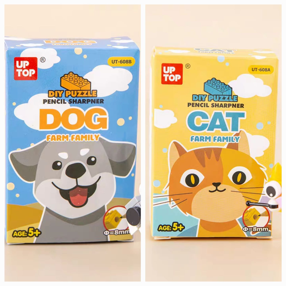 (Caja con 24 unidades de sacapuntas con forma de gato y perro tipo Legos para armar).