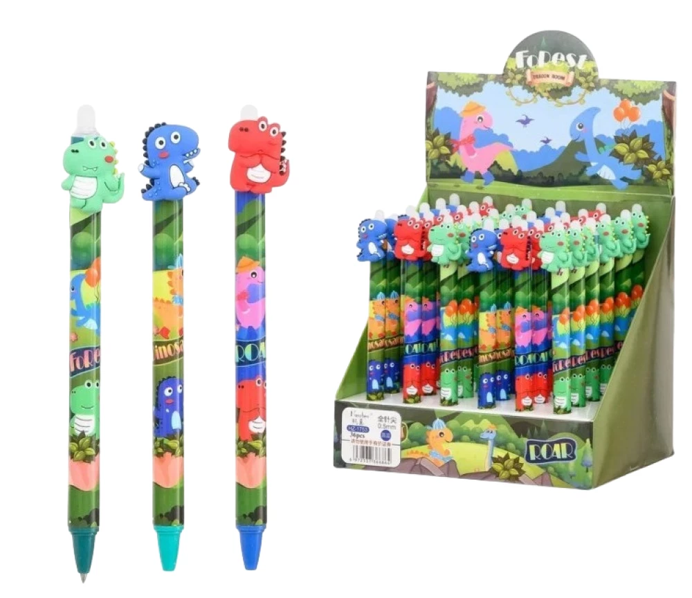 (Birome Retractil con tinta azul borrable, cuenta con diseño de dinosaurio. Ideales para regalar o llevar al colegio).