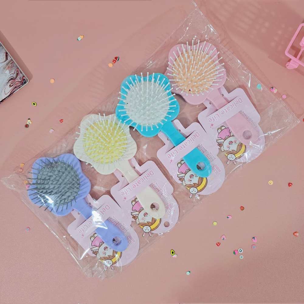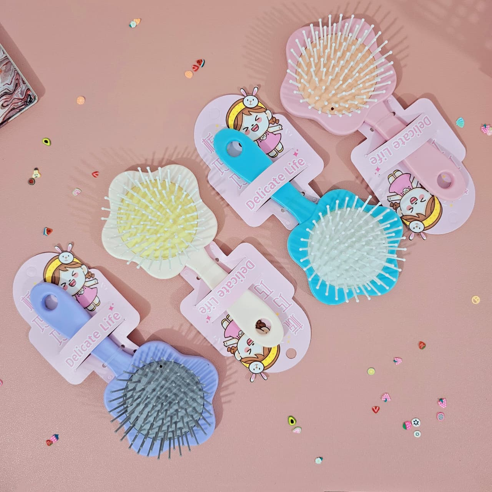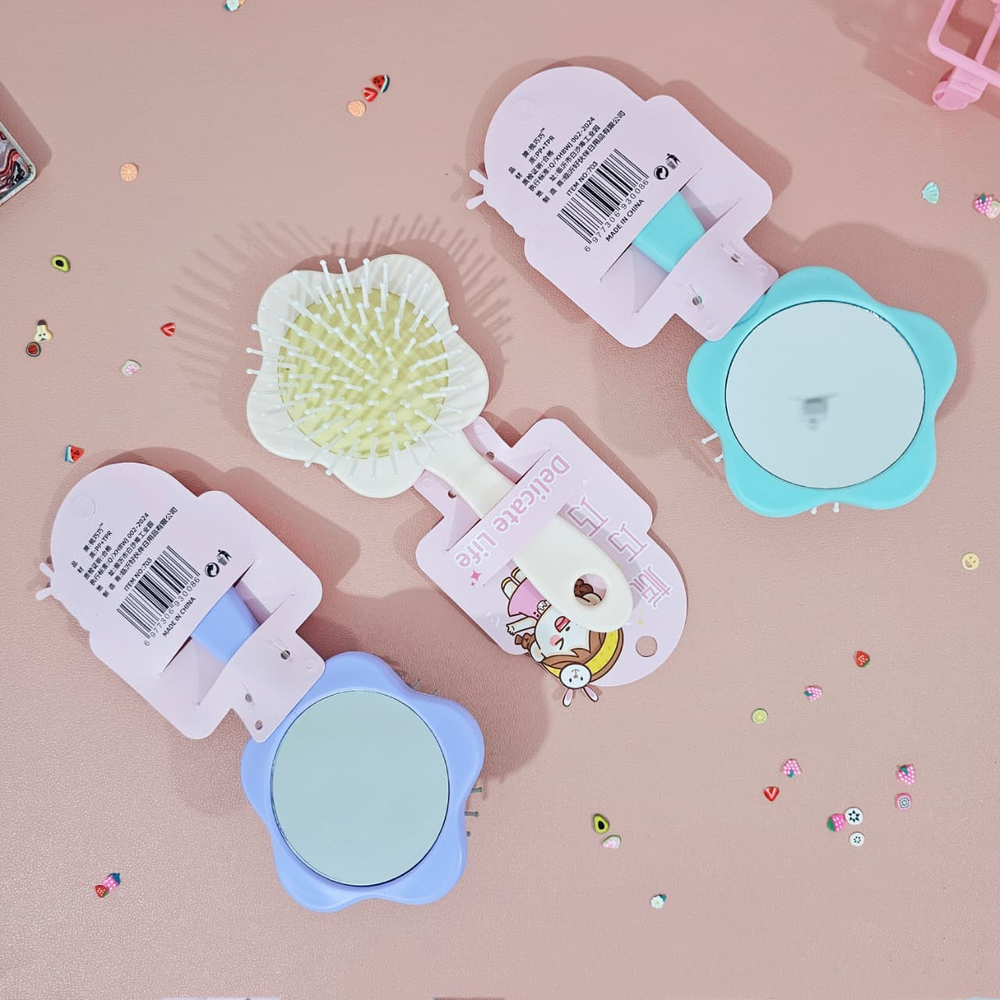 (Cepillo de pelo con forma de flor y espejo en la parte trasera, con cojín y previene la estática. Disponible en cuatro colores ).