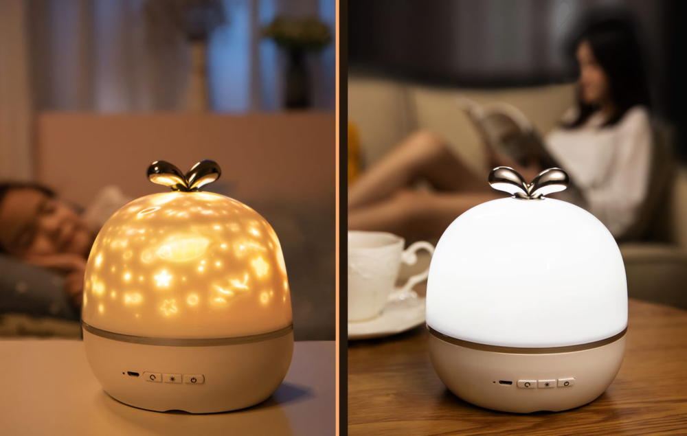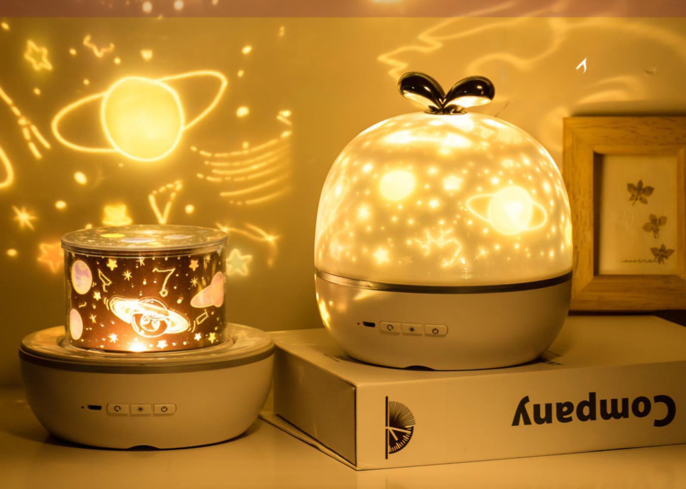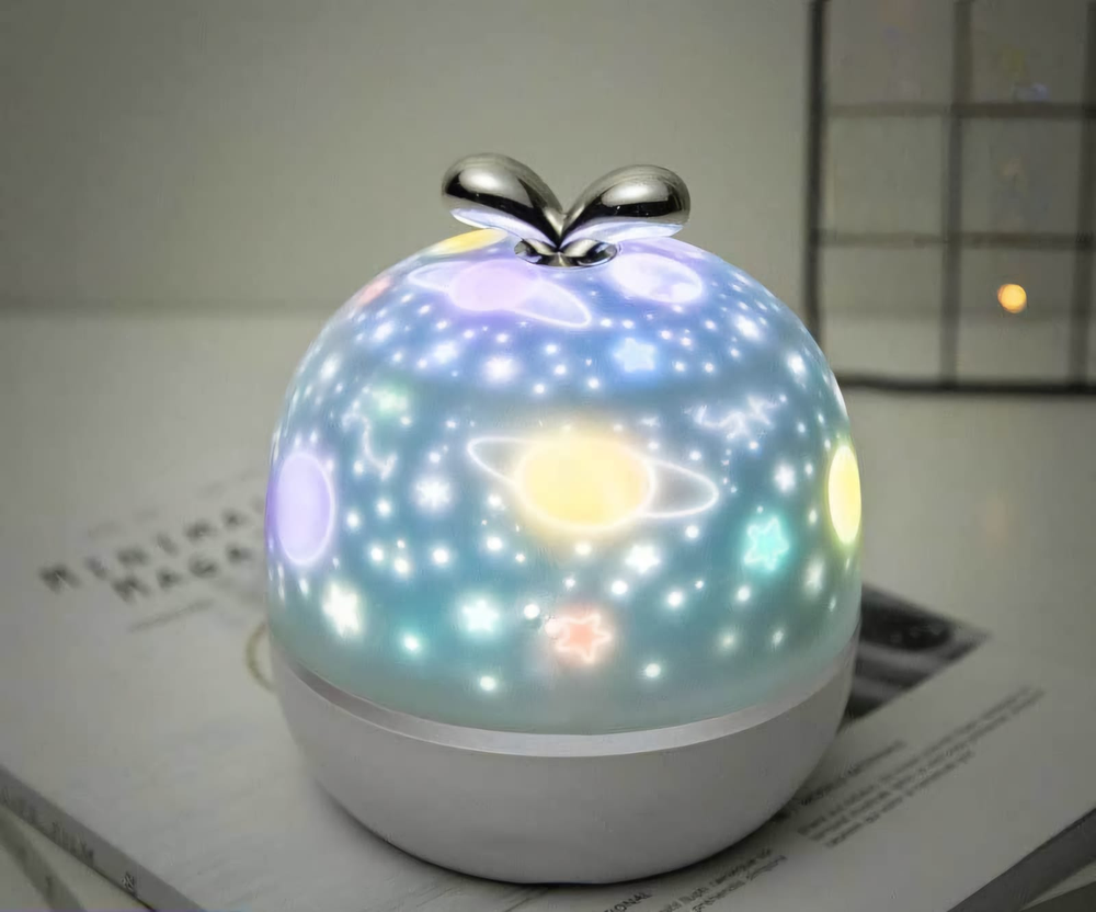 (Este producto es una lámpara de doble propósito, que puede funcionar como luz nocturna o como proyector de estrellas. La proyección puede girarse para crear diferentes efectos y atmósferas. Incluye 6 tipos de películas para variar la proyección, creando un ambiente agradable y relajante para ayudar a los niños a dormir. Cuenta con cable USB, funciona enchufada o con 4 pilas AAA (NO INCLUIDAS).