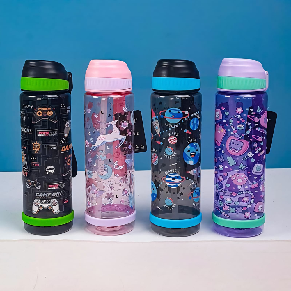 (Botella animada para niños, niñas y adultos, tiene capacidad de 750ml. Son cómodas y fáciles de transportar. Cuentan con pico rebatible, tapa a rosca y un correa).