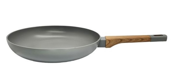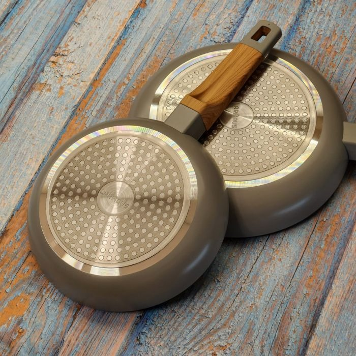 (Sartenes fabricadas en aluminio forjado con un revestimiento interior antiadherente de color gris y un mango de baquelita con acabado tipo madera. Son ideales para cocinar una amplia variedad de alimentos de manera uniforme gracias a su excelente distribución del calor. Su revestimiento antiadherente permite cocinar con poco o ningún aceite, evitando que los alimentos se peguen y facilitando la limpieza. Son aptas para diversas fuentes de calor como gas, eléctricas, vitrocerámica e inducción, y también son aptas para lavavajillas).