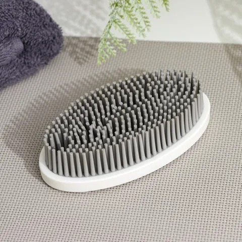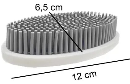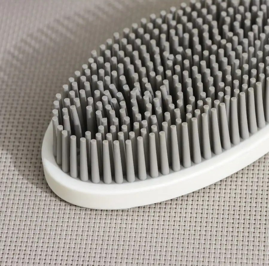 (Cepillo diseñado para un agarre cómodo en la mano, lo que facilita su uso. Las cerdas son de silicona gris, mientras que la base es de plástico blanco. Es reutilizable, eficaz para la limpieza y no deja residuos. Puede usarse para limpiar diversas superficies como trajes y sofás).