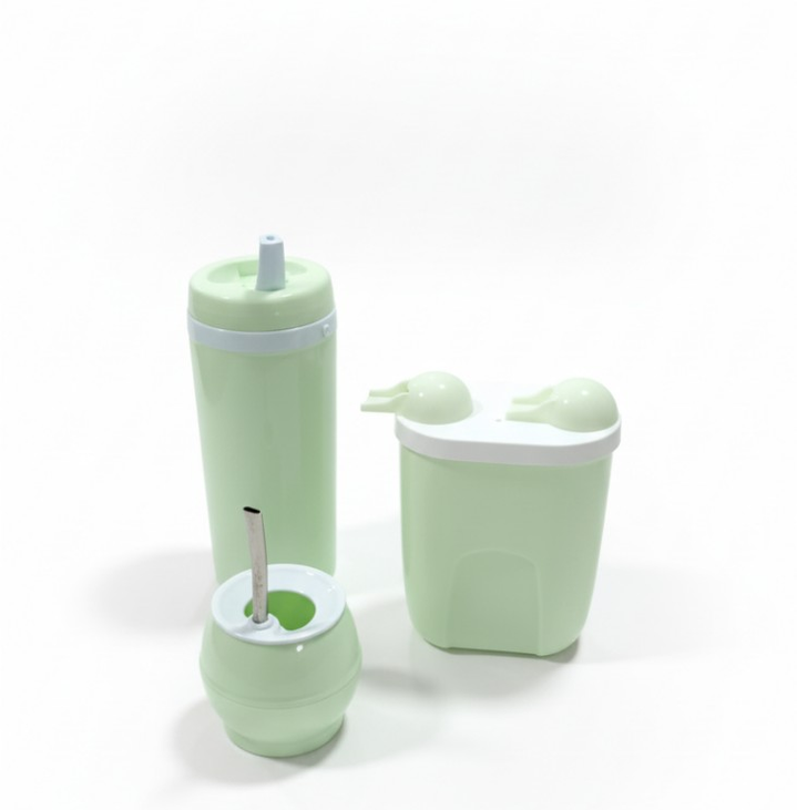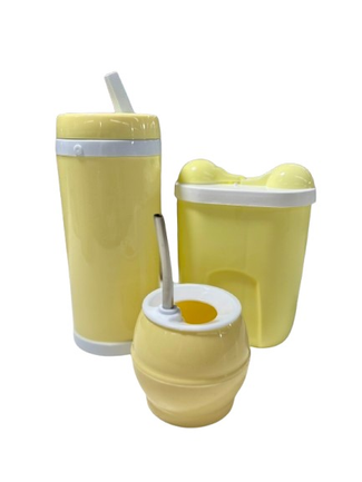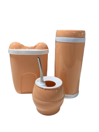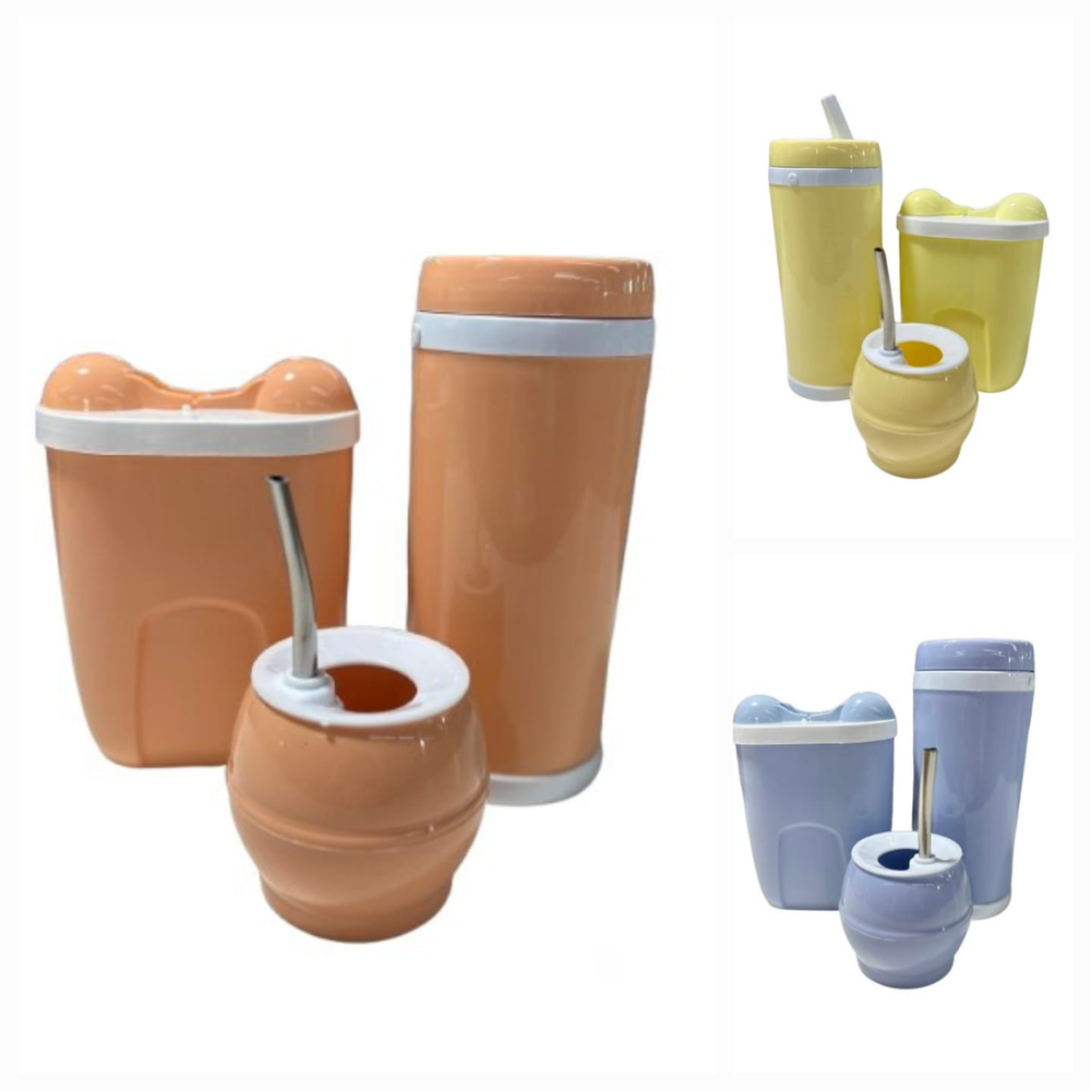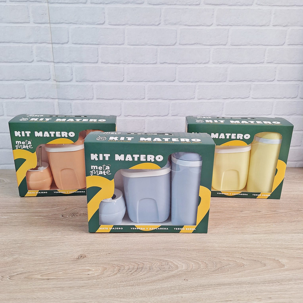 (Este kit incluye un mate viajero, un termo personal (de 600 cm³), y un contenedor que funciona como yerbera y azucarera en una sola pieza. Vienen en color naranja, amarillo y celeste. Ideal para llevar el mate a cualquier lugar, ya sea de viaje o para uso diario, y también son una buena opción como regalo. Son fáciles de transportar y limpiar, lo que los hace muy convenientes).