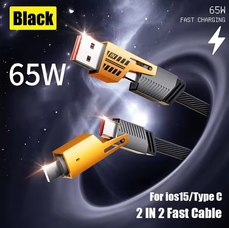 (Cable de carga rápida de 65W, diseñado para la carga veloz de dispositivos compatibles con iOS y Tipo-C. Su función principal es permitir una carga más rápida de dispositivos electrónicos en comparación con los cables de carga estándar. Esto se logra al permitir un mayor flujo de corriente eléctrica (hasta 65W en este caso) del cargador al dispositivo. Está diseñado para ser compatible con dispositivos que soporten carga rápida, incluyendo aquellos con puertos iOS (como iPhones/iPads con iOS 15 o superior) y puertos Type-C (comúnmente encontrados en teléfonos Android, laptops, etc.). Reduce el tiempo necesario para recargar la batería de los dispositivos, lo que lo hace conveniente para usuarios que necesitan cargar sus aparatos rápidamente).