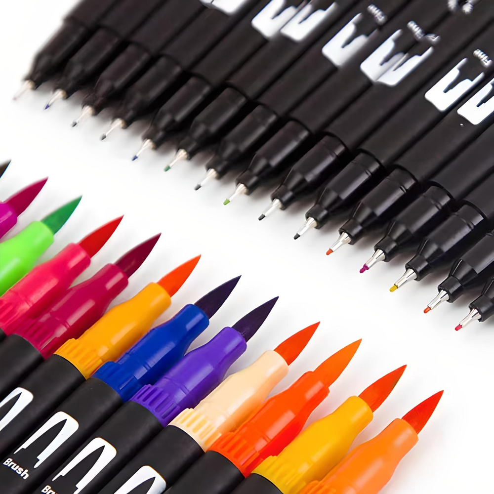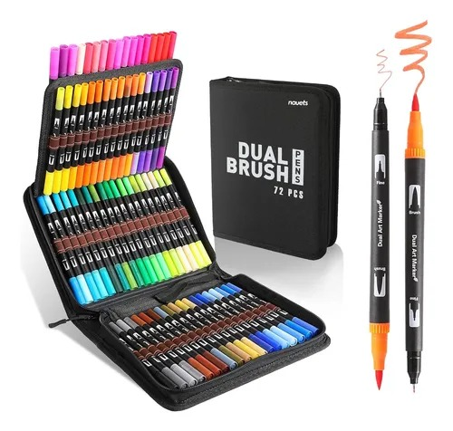 (Marcadores Dual Brush x 72 piezas. Contienen marcadores con doble punta, una es microfibra la otra es punta pincel; Incluye estuche organizador práctico, ligero y liviano y una amplia gama de colores que no se repiten).
