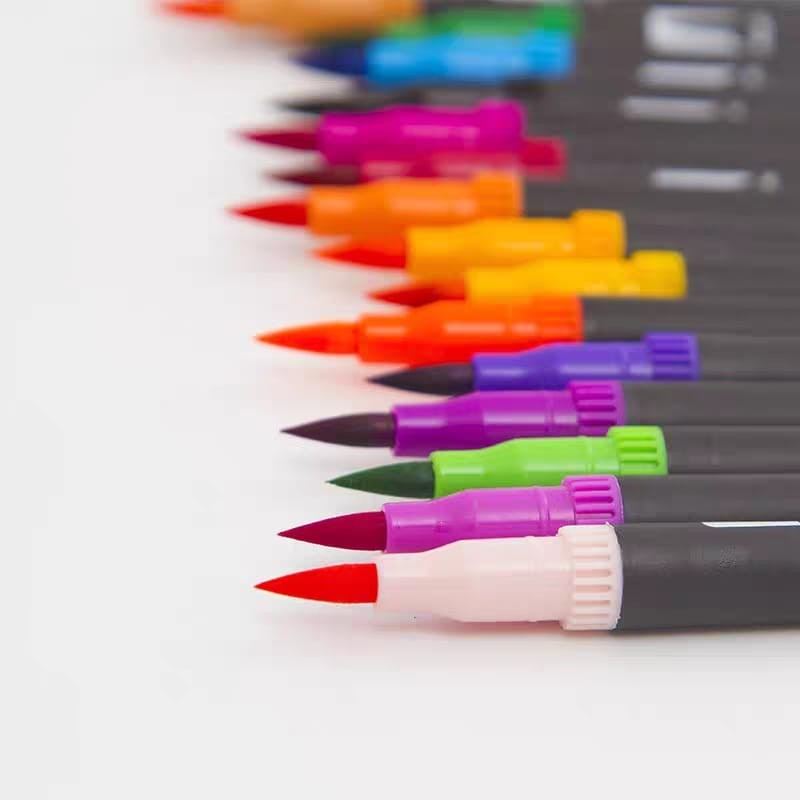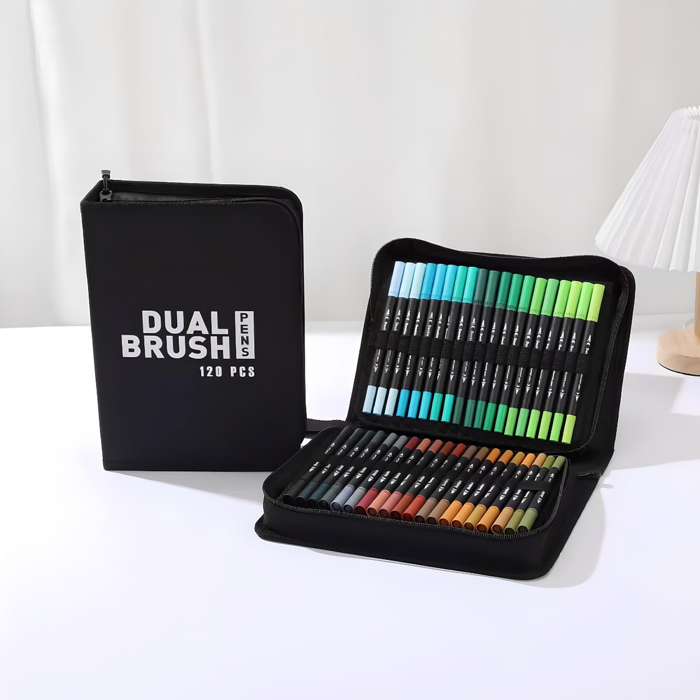 (Marcadores Dual Brush x 120 piezas. Contienen marcadores con doble punta, una es microfibra la otra es punta pincel indeleble ; Incluye estuche organizador práctico, ligero y liviano y una amplia gama de colores que no se repiten).