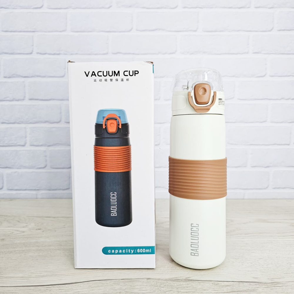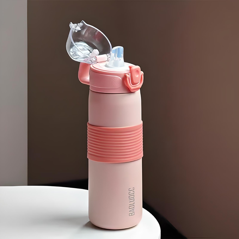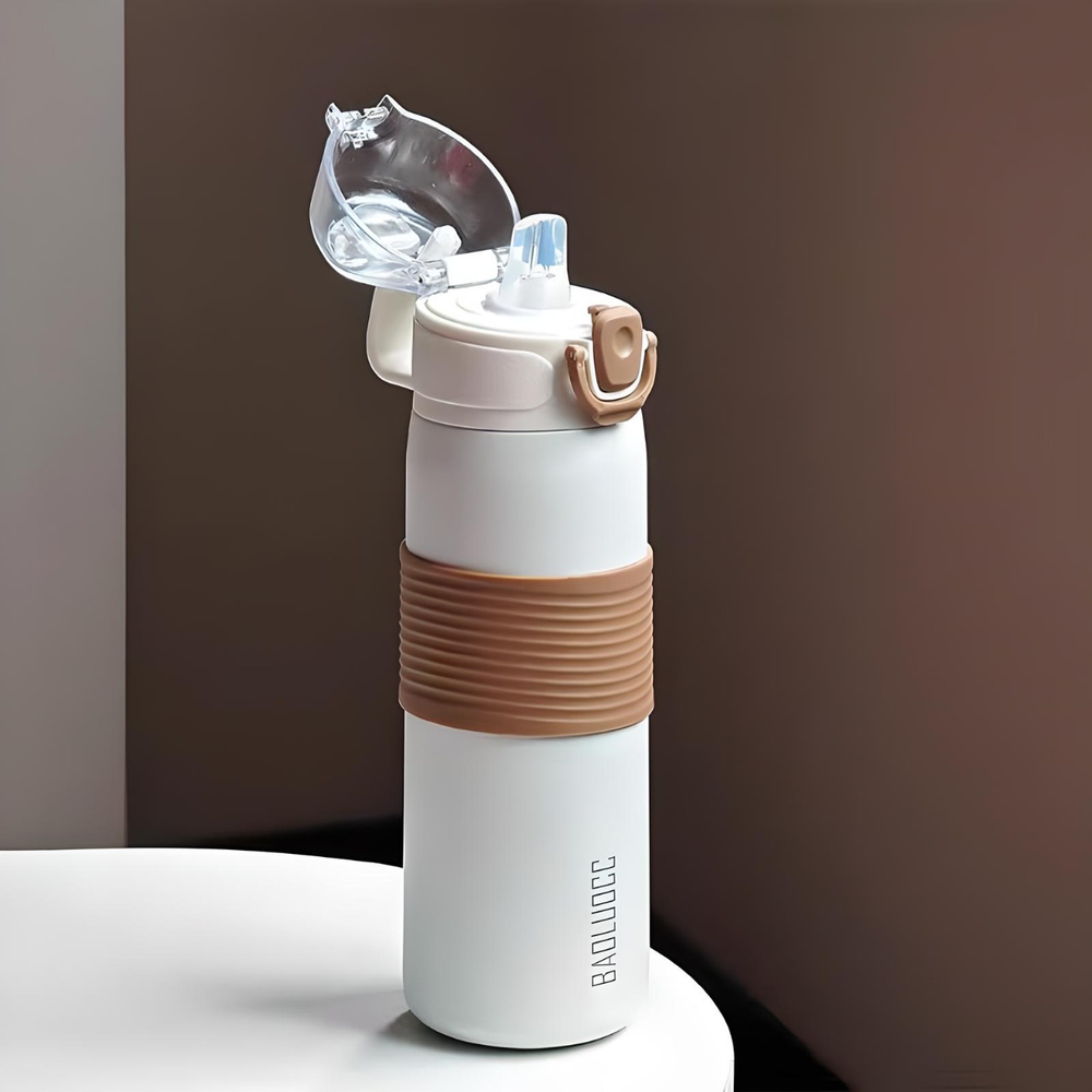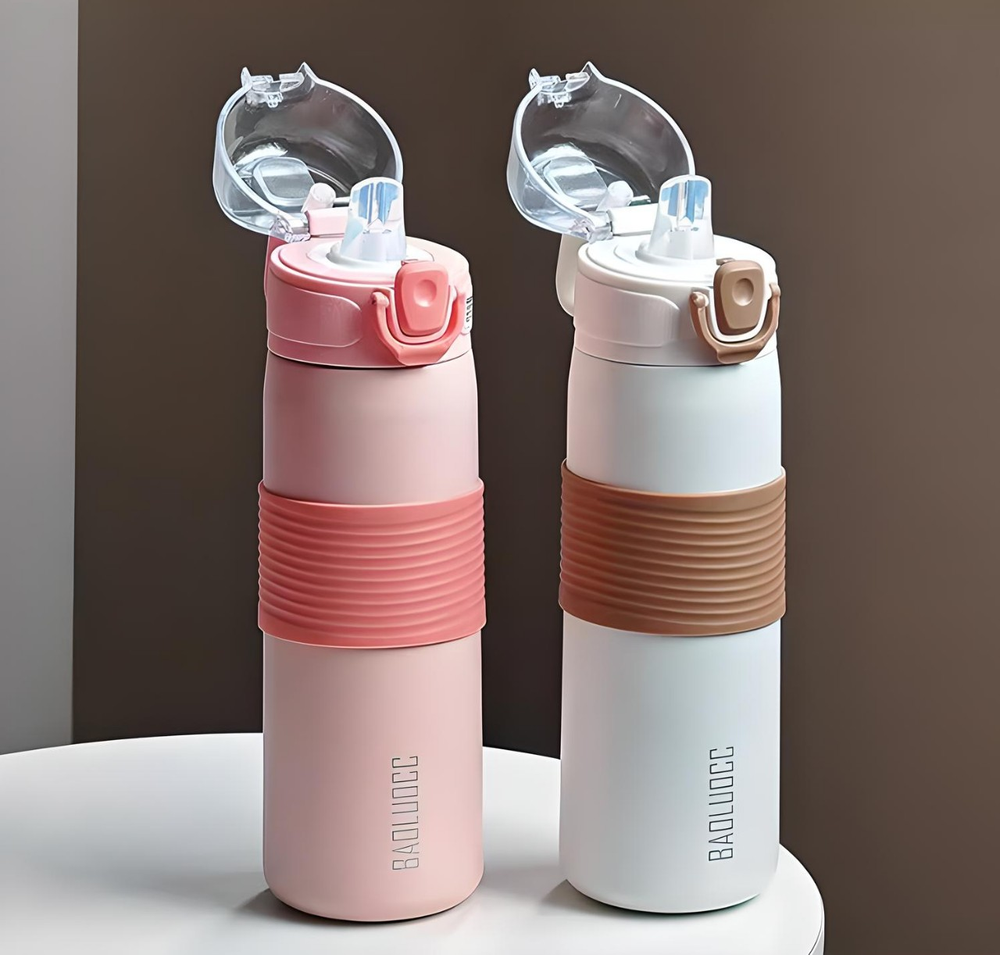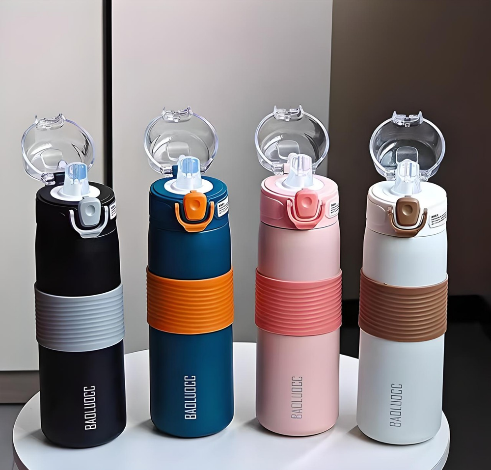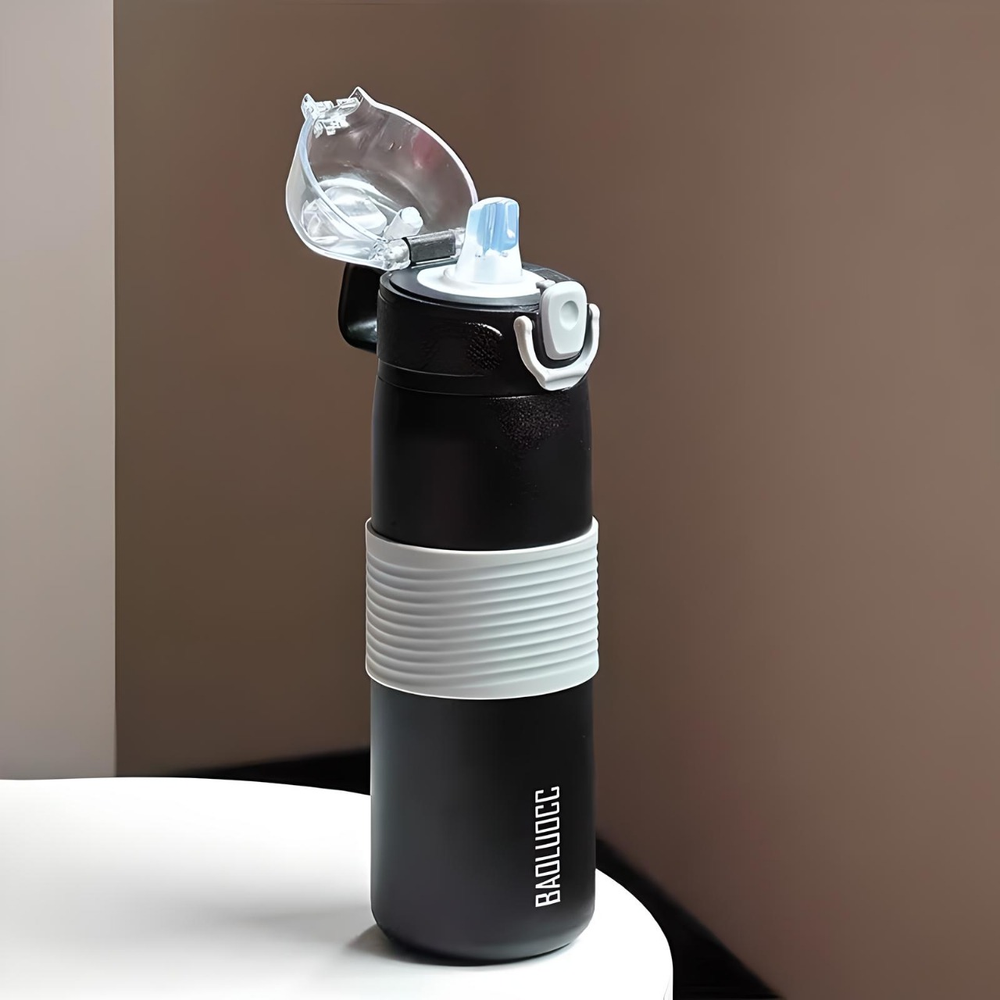 (Esta botella de acero inoxidable cuenta con una capacidad de 600ml, tapa hermética, sorbete, pico y base antideslizante . La misma cuenta con una manija para un mejor transporte, mantiene tanto agua fría como caliente y es apta lavavajillas. Material de excelente calidad).
