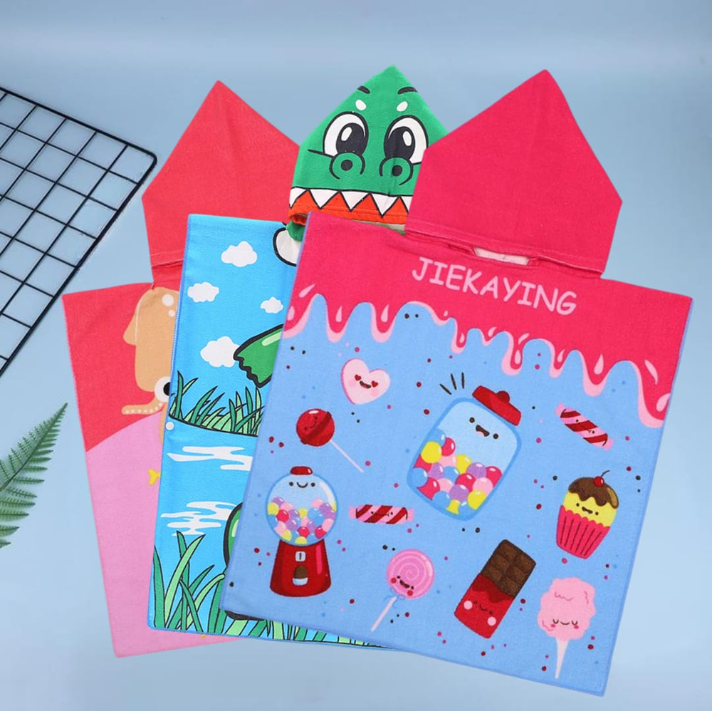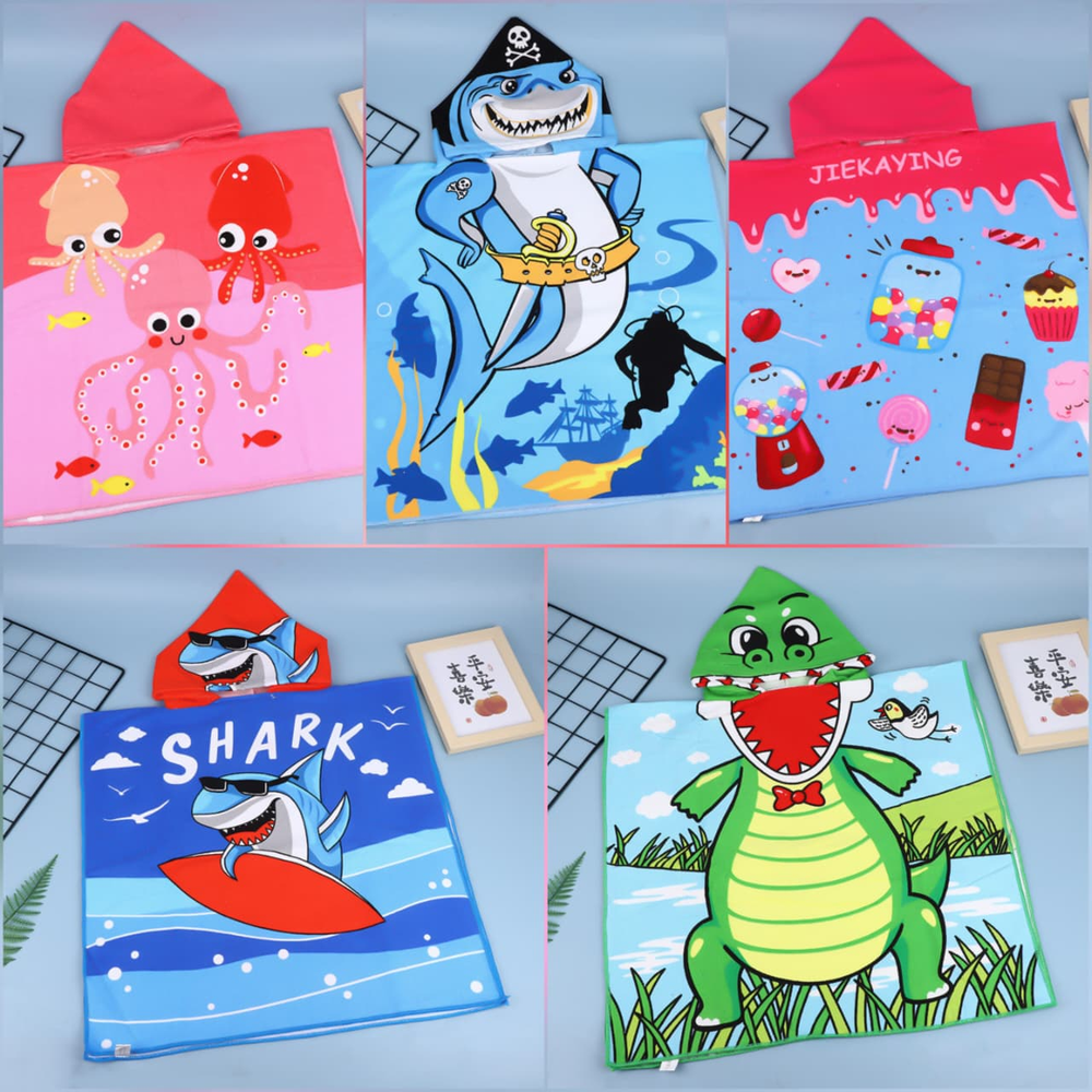 (Ponchos de toalla diseñadas para ser utilizadas después del baño, la piscina o la playa. Permiten envolver al niño completamente para un secado eficiente después de actividades acuáticas. Su diseño con capucha ayuda a mantener la cabeza y el cuerpo abrigados, especialmente útil en ambientes fríos o con viento. Son fáciles de poner y quitar, ofreciendo libertad de movimiento para los niños a diferencia de las toallas tradicionales que pueden caerse. Disponibles en diseños surtidos tanto de nene como de nena).