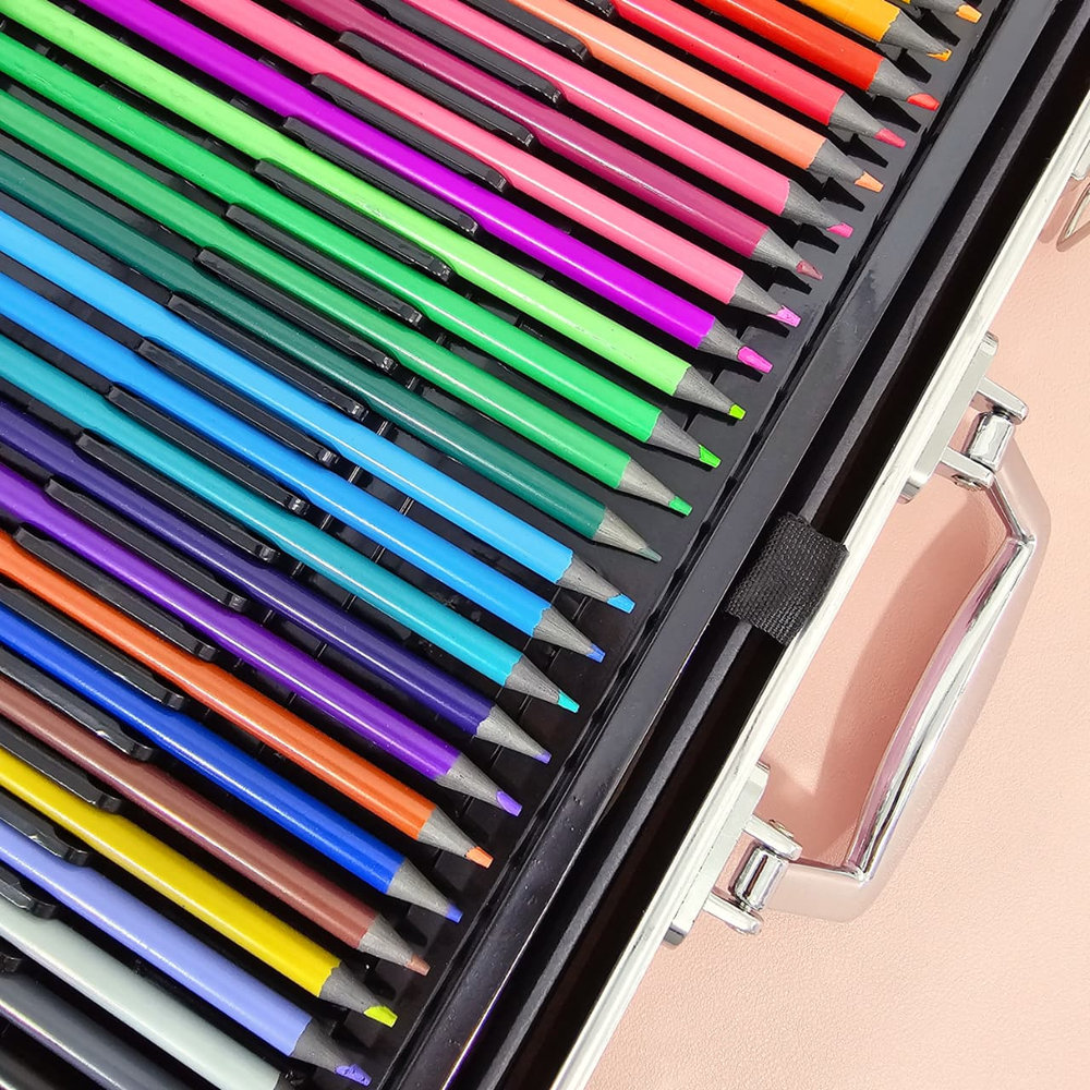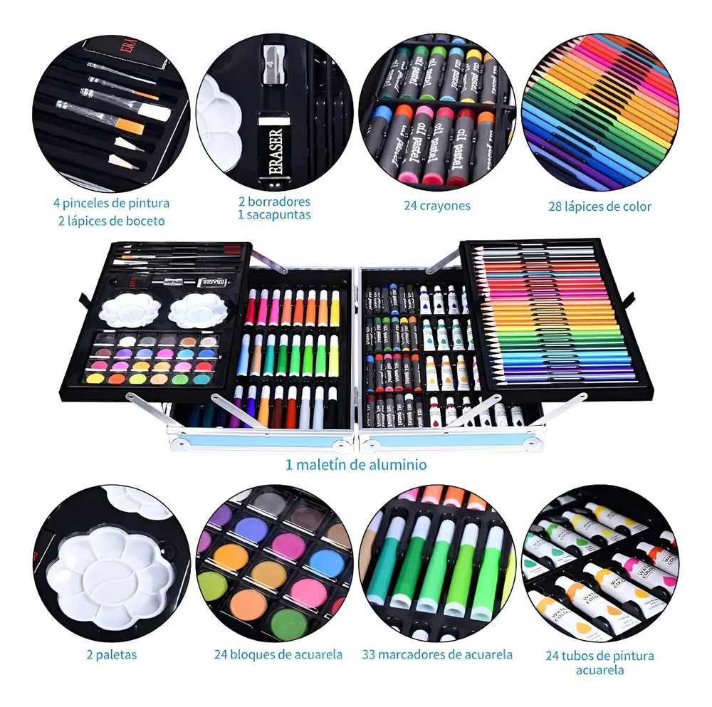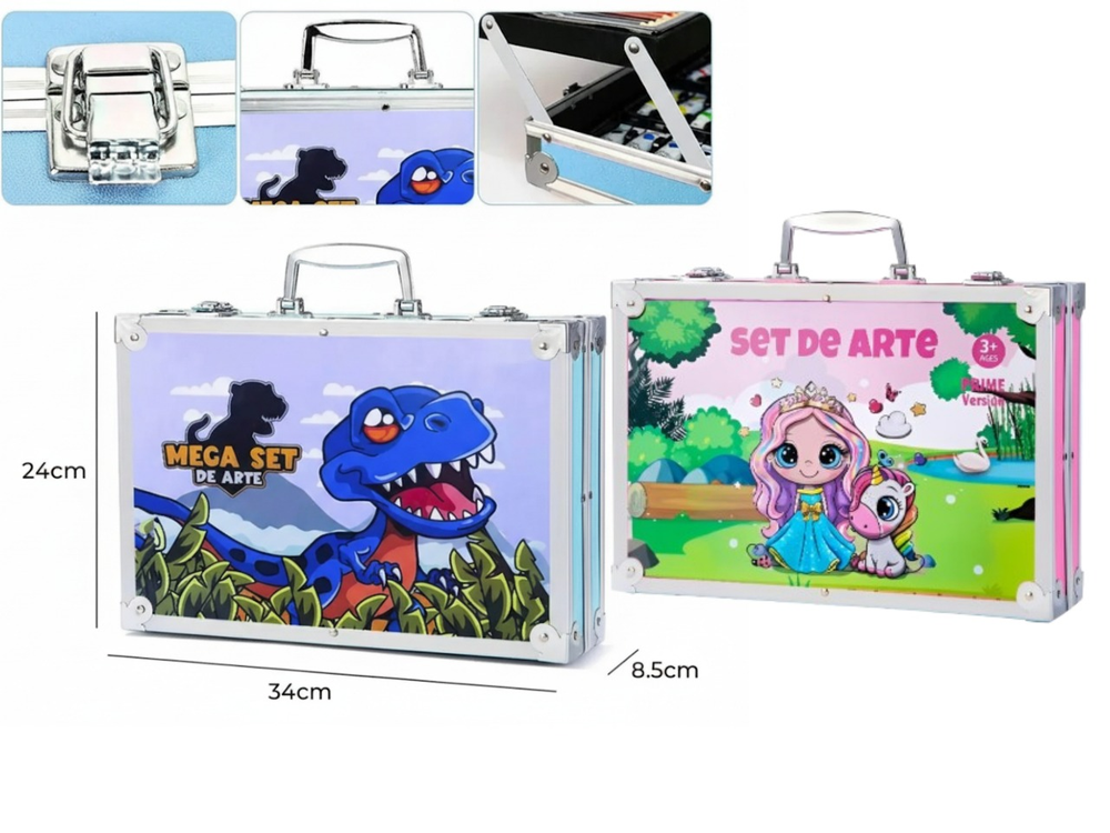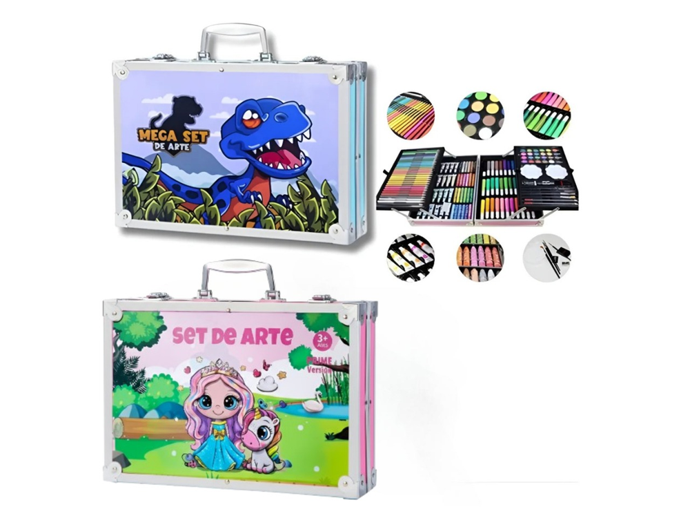 (Set de arte que incluye diferentes marcadores, crayones, lápices de colores, acuarelas, pinceles y otros accesorios, ofreciendo diversas opciones para crear. Ideal para regalar, vienen con diseños coloridos y de variados personajes animados).