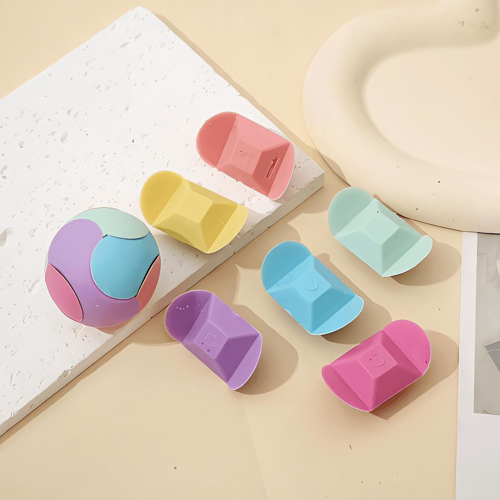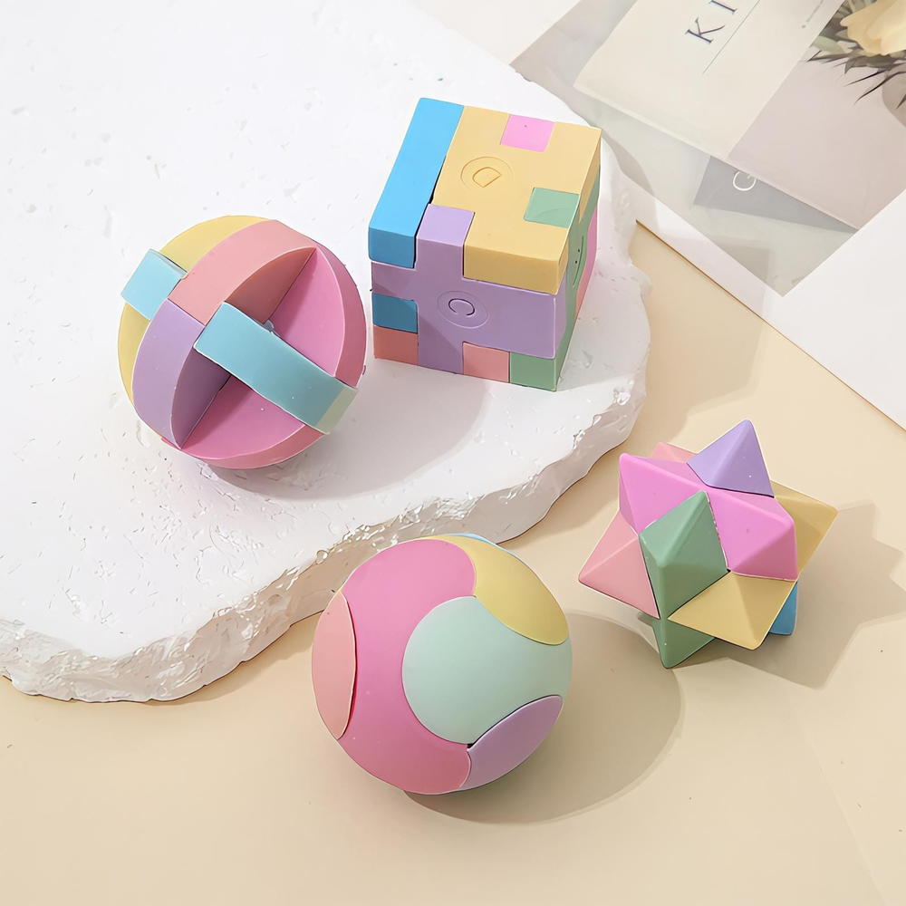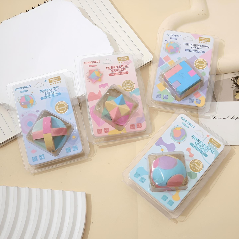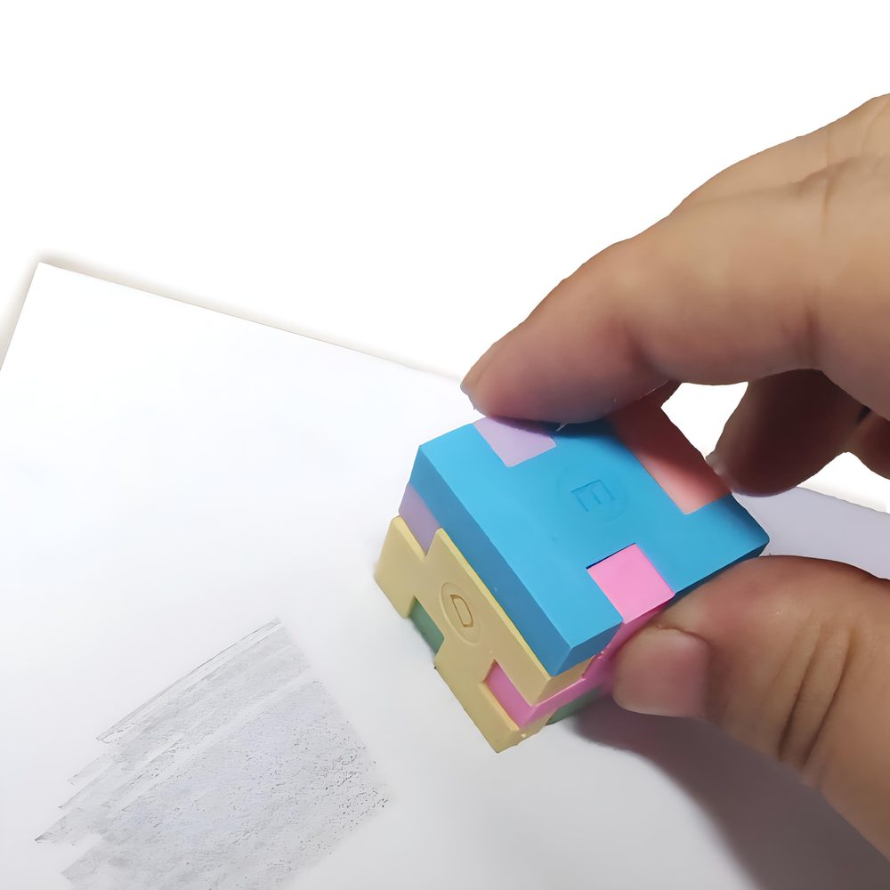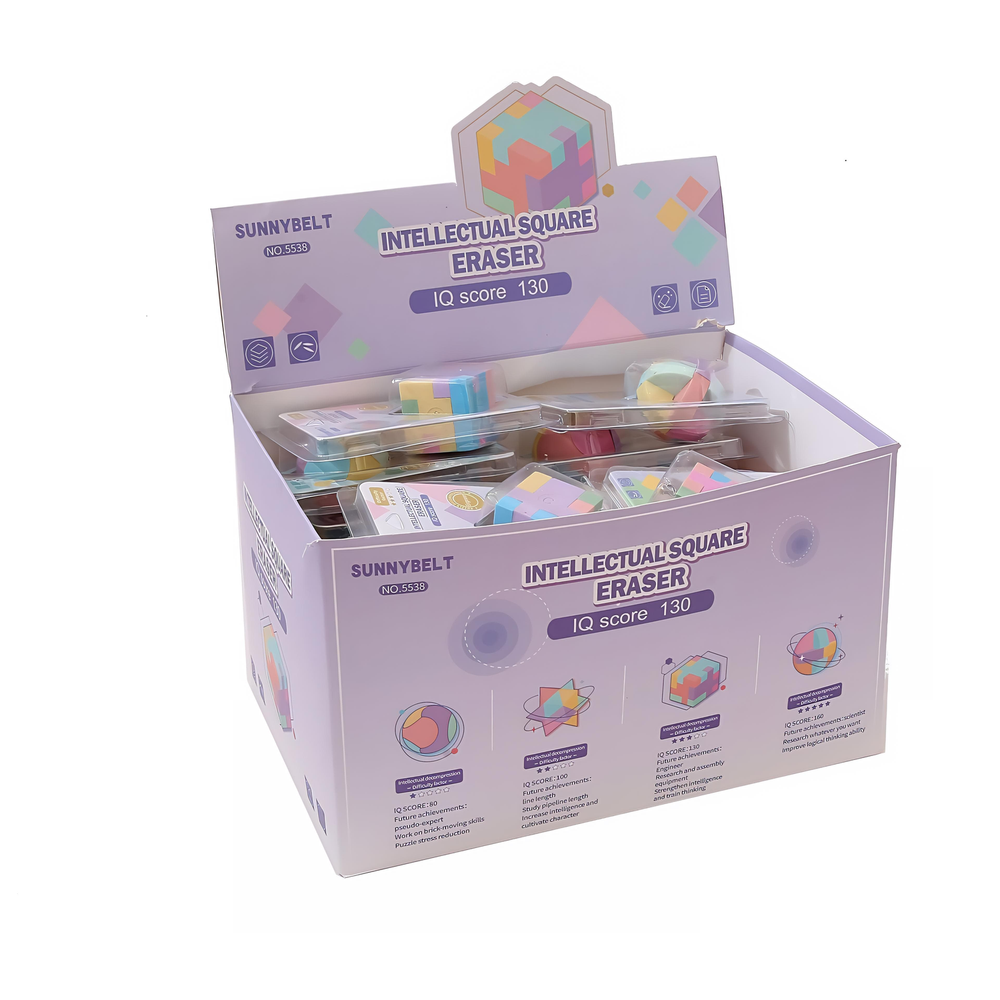 (Goma de borrar en forma de cubo, esfera y una estrella. Viene en varios colores, además de cumplir con la función de borrar también se usa como objeto antistress. La caja trae 24 unidades surtidas de formas geométricas).