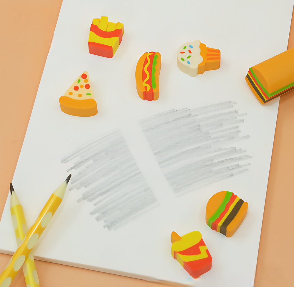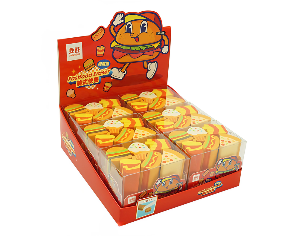 (Goma de borrar en forma de hamburguesas, panchos, pizza, papas fritas, helado y gaseosa. Tiene un diseño alargado para que puedas cortarlo en pedacitos que desees. Cada caja cuenta con 6 set surtidos).